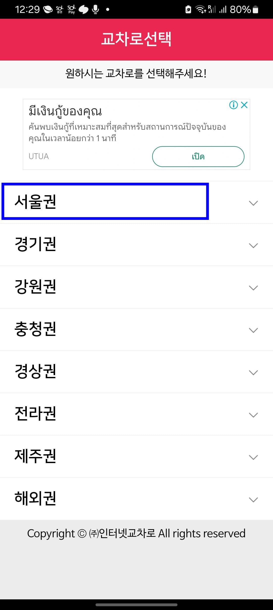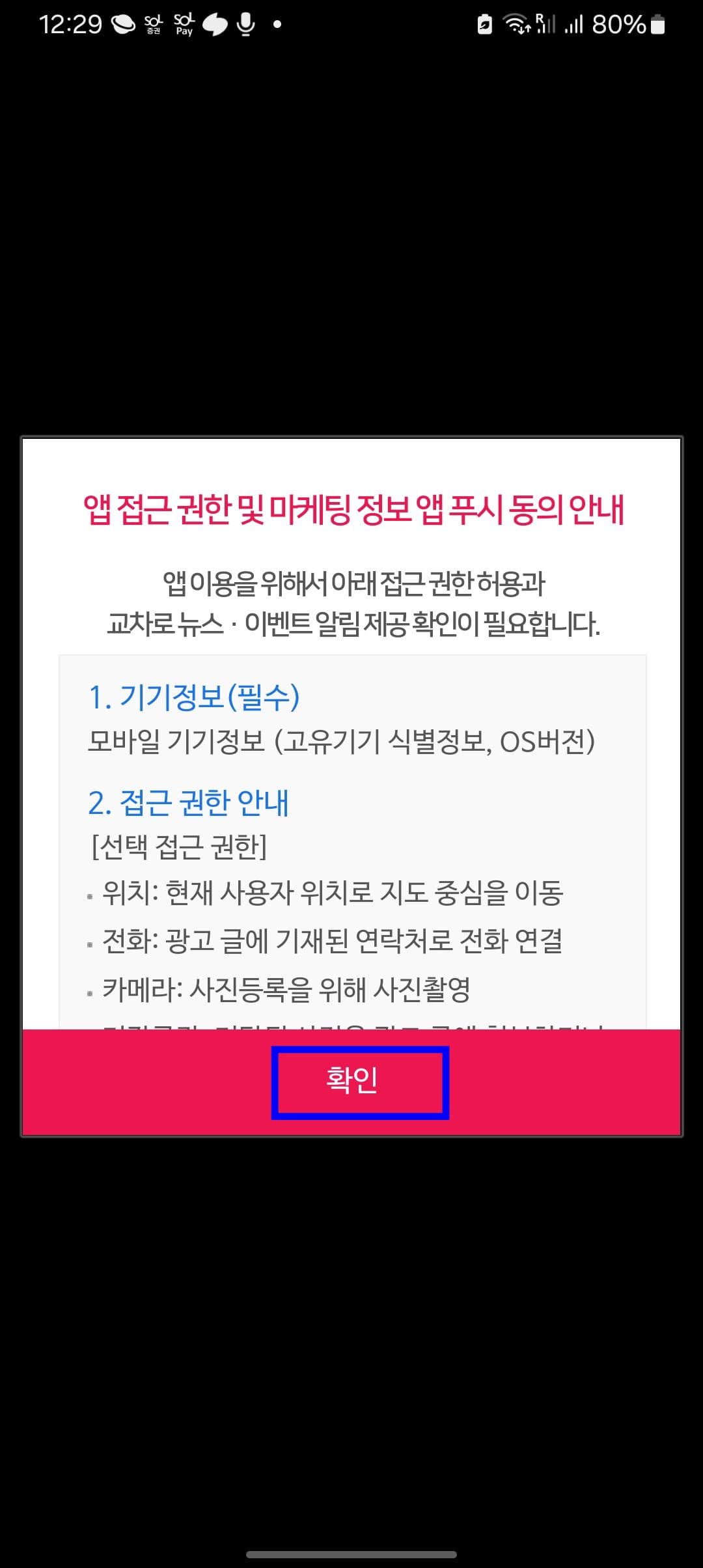 교차로 앱 설치 후 실행을 하면 위와 같이 앱 접근 권한 및 알림 동의 창이 표시됩니다. 하단의 확인 버튼을 터치합니다. 이후 교차로 선택 페이지에서 서울권, 경기권, 강원권, 충청권 등 원하는 지역을 터치합니다. 서울권 하단에 세부 메뉴가 표시되면 원하는 교차로를 터치합니다. 여기에서는 남부교차로를 살펴보겠습니다.