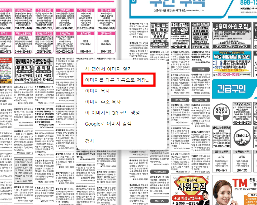 구인구직 페이지를 조회해 보았습니다. 신문을 크게 보려면 마우스 우클릭을 합니다. 세부 메뉴가 표시되면 [이미지를 다른 이름으로 저장]을 선택합니다. 이후 컴퓨터에 저장하도록 합니다.