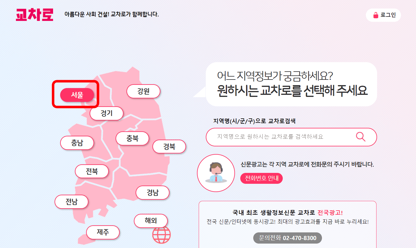 교차로 홈페이지에 방문하시면 위와 같은 화면을 볼 수 있습니다. 좌측 우리나라 지도 위에 표시된 지역을 마우스로 클릭합니다. 여기에서는 서울 지역 교차로 신문을 보도록 하겠습니다.