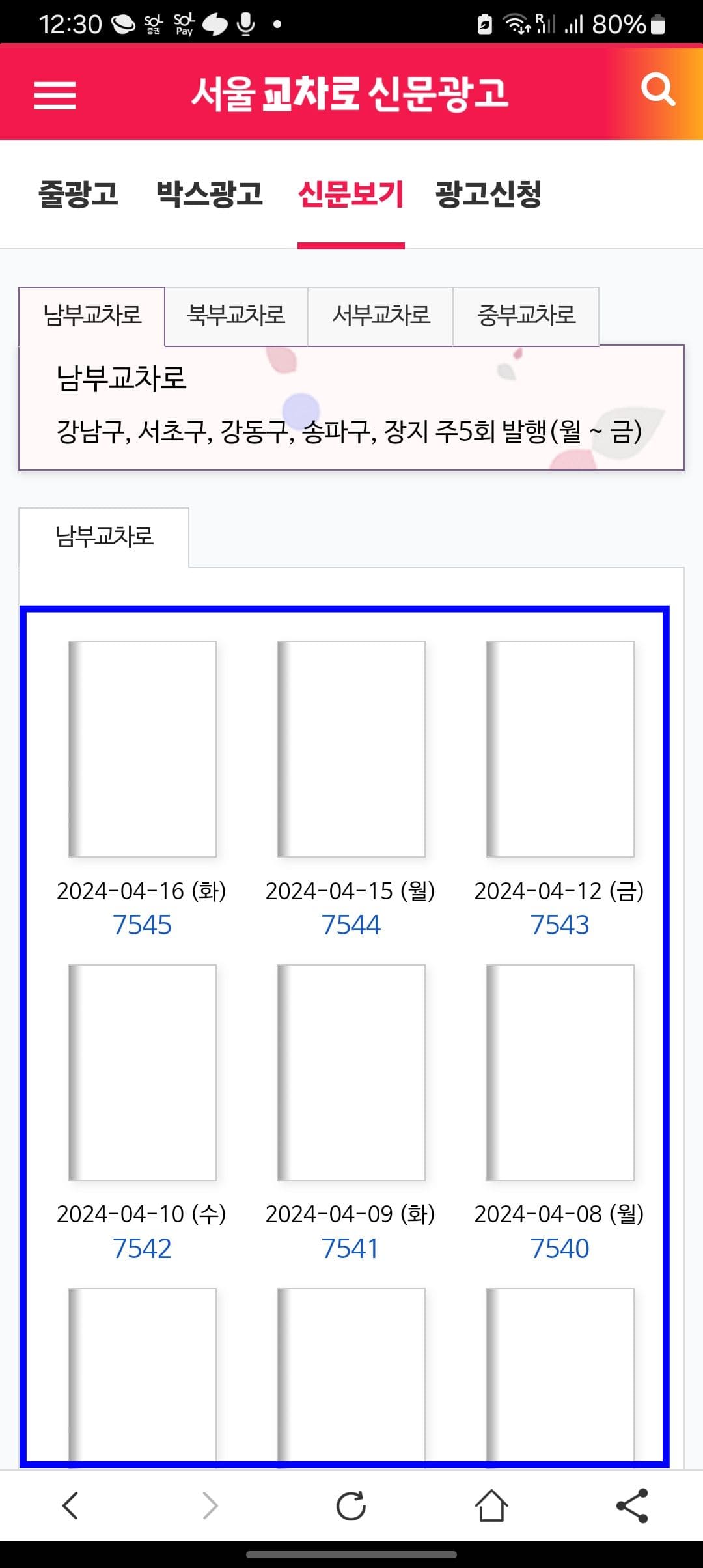 서울 교차로 페이지가 표시되면 마찬가지로 검색창 하단의 [신문 보기] 메뉴를 선택합니다. 남부 교차로가 표시되면 하단에서 원하는 날짜의 교차로 신문을 터치하여 보시면 됩니다.