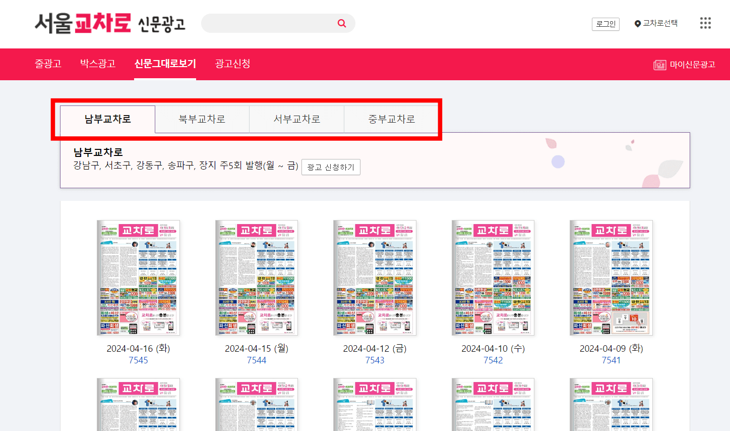 서울 교차로 페이지로 넘어가면 검색창 하단의 [신문 그대로 보기] 메뉴를 클릭합니다. 서울 교차로 신문은 남부교차로, 북부 교차로, 서부 교차로, 중부 교차로로 분류되어 있습니다. 제가 살고 있는 지역인 서부교차로를 선택해 보았습니다. 이후 하단의 신문에서 오늘자 신문을 선택합니다.