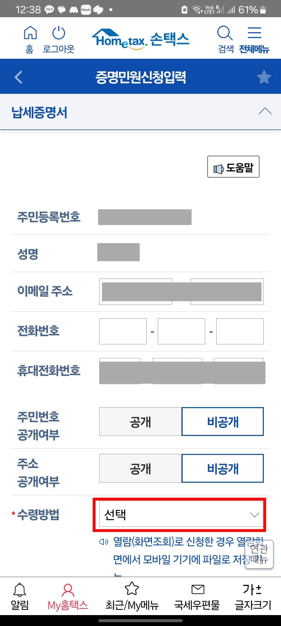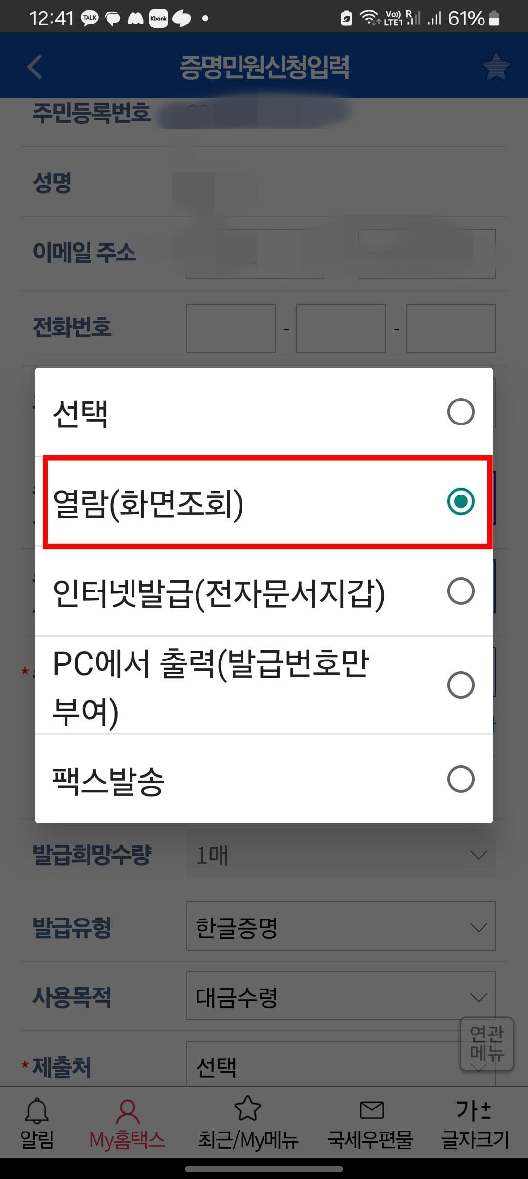 인증이 완료되면 증명민원신청입력 페이지가 표시됩니다. 수령방법을 터치하면 열람(화면조회)를 선택합니다. 이 방법은 열람하고 PDF로 저장할 수 있지만 법적인 효력은 없습니다. 만약 법적인 효력을 가진 증명을 하시려면 인터넷발급 (전자문서지갑)을 선택하면 기관에 바로 제출할 수 있습니다.