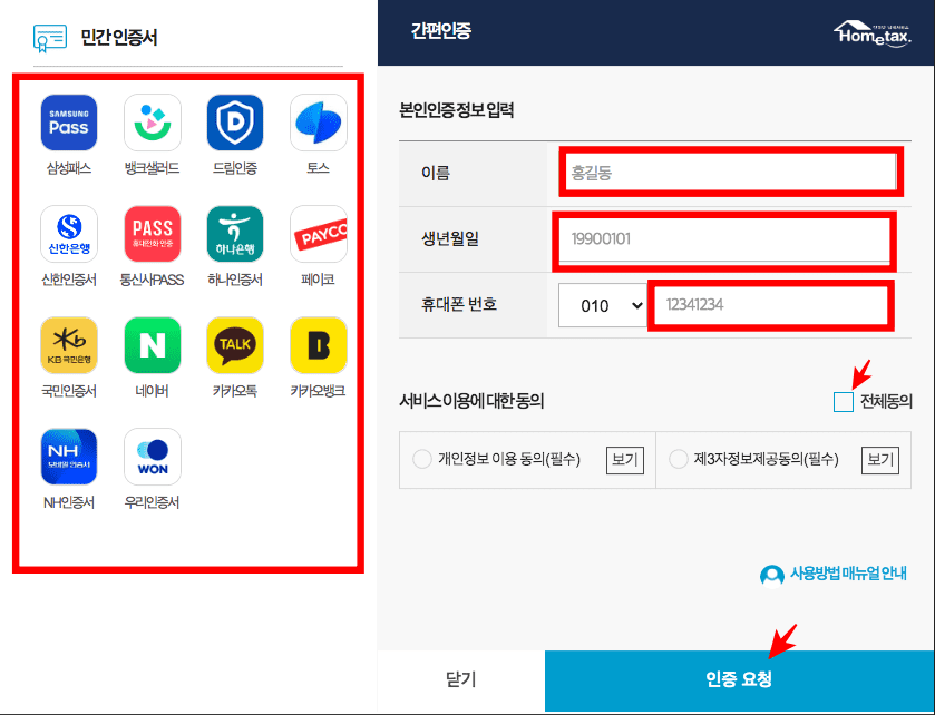 로그인 화면이 표시되면 공동 및 금융인증서, 간편인증, 아이디, 생체인증, 비회원 로그인 중 원하는 로그인 방법을 선택합니다. 간편 인증 진행 시 좌측에서 보유한 민간인증서를 선택하고 우측에 이름, 생년월일, 휴대폰번호 입력 후 서비스이용에 대한 전체동의 표시를 하고 하단의 인증요청 버튼을 클릭합니다.