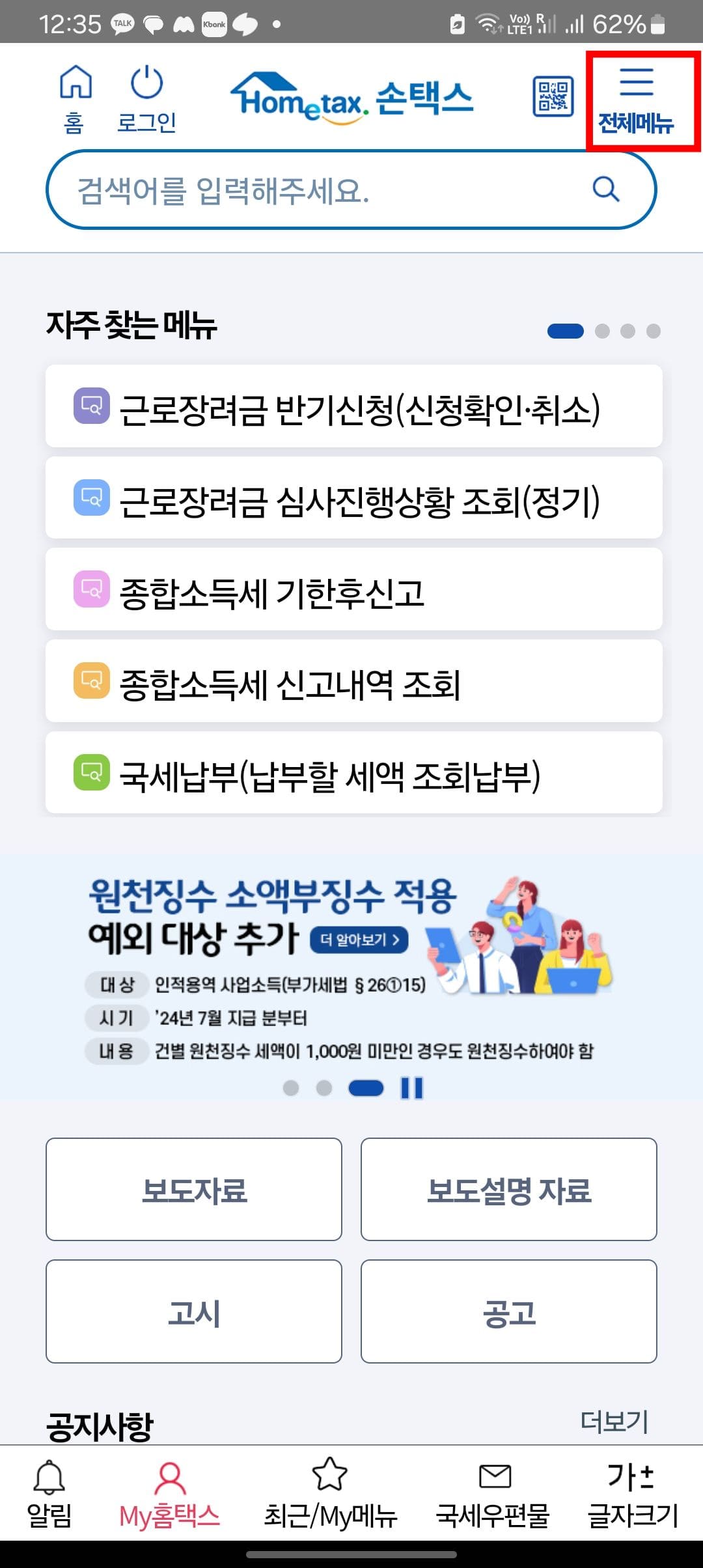 메인 화면이 표시되면 우측 상단의 [전체메뉴]를 터치합니다. 전체메뉴에서 [국세증명 사명자등록 세금 관련 신청/신고] 메뉴를 터치한 후 오른쪽에서 즉시발급 증명을 터치합니다. 아래에 세부 메뉴가 표시되면 납세증명서 (국세완납증명) 메뉴를 터치합니다.
