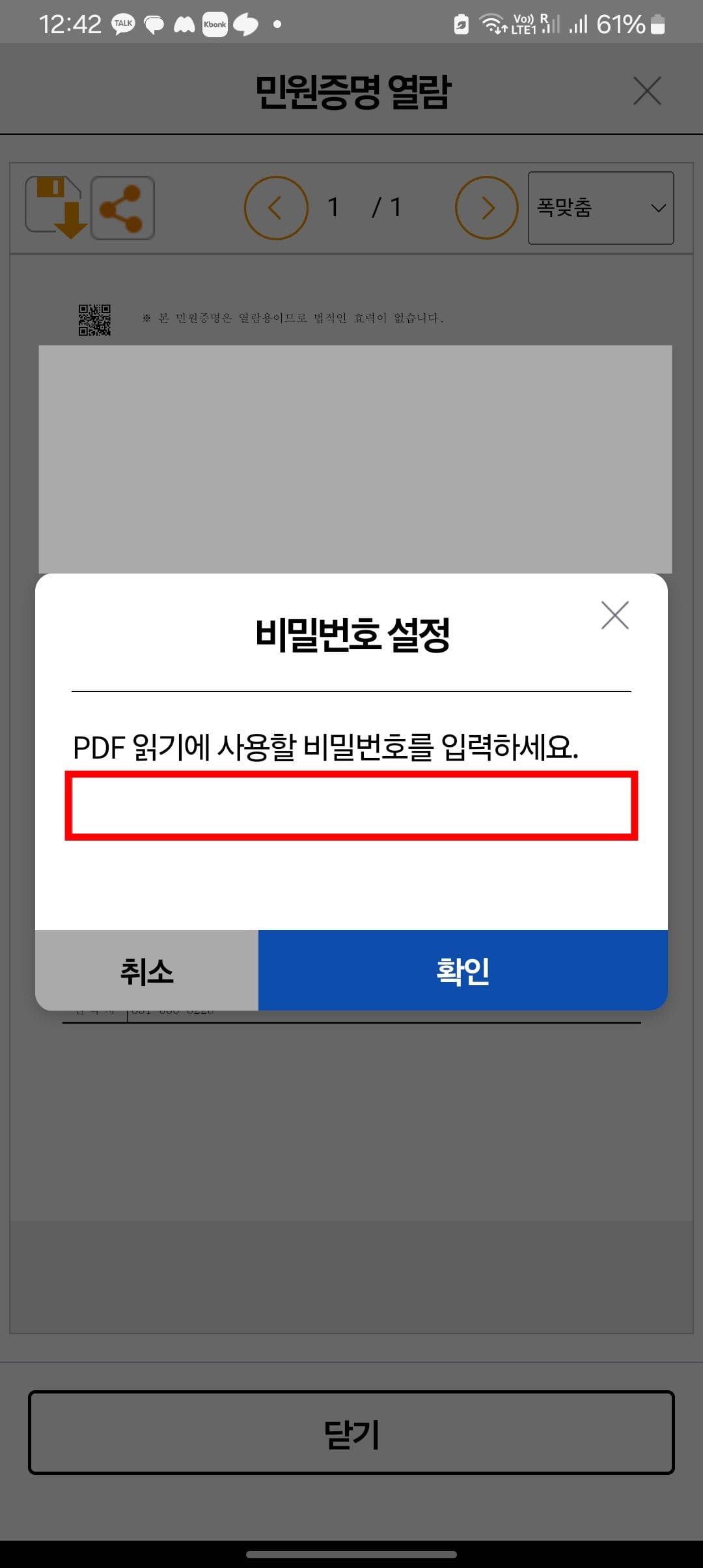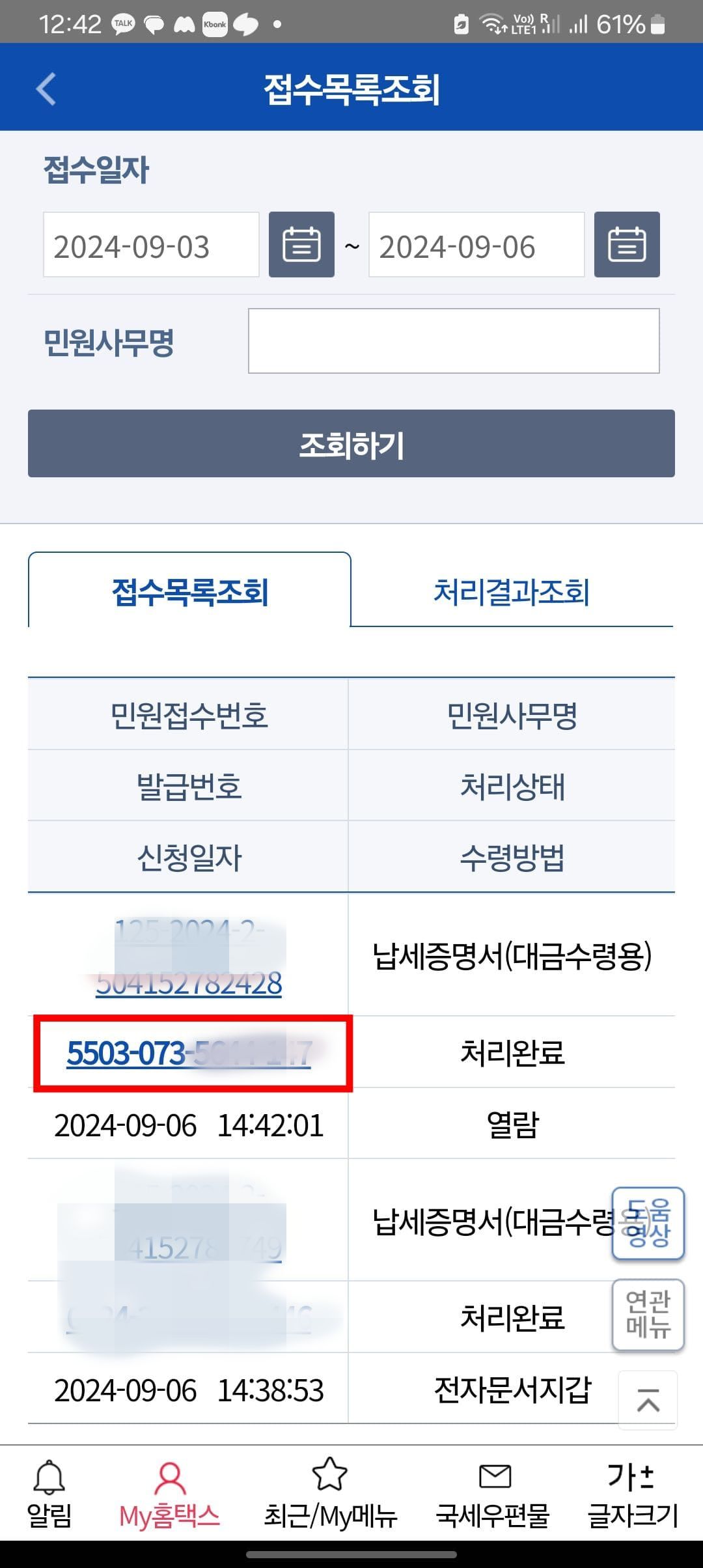 접수목록 조회에서 처리완료된 접수번호를 터치하면 납세증명서를 확인할 수 있습니다. 좌측 상단의 저장 아이콘을 터치하면 PDF 읽기에 사용할 비밀번호 입력 후 모바일에 저장할 수 있습니다.