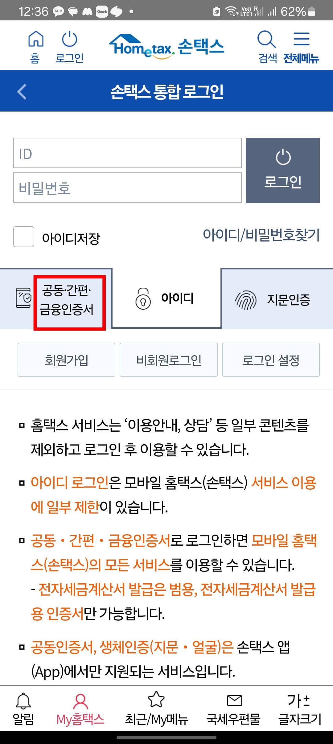 로그인 화면이 표시되면 공동, 간편, 금융인증서를 선택합니다. 간편인증의 경우 보유한 민간인증서 선택 후 이름과 생년월일, 휴대폰번호를 입력하고 하단의 다음 버튼을 터치합니다.