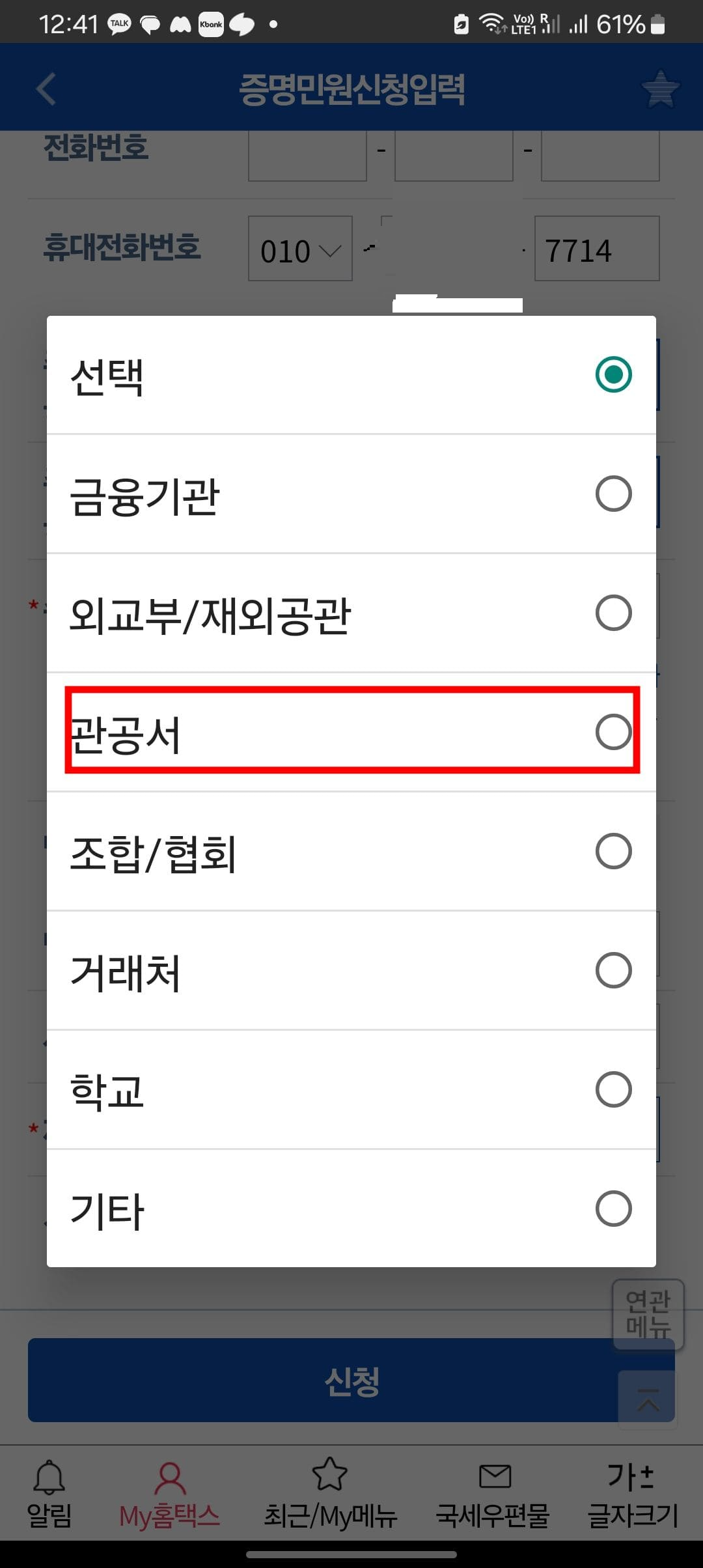 하단의 제출처를 터치하여 용도에 맞는 제출처를 선택합니다. 이후 하단의 신청 버튼을 터치하면 국세완납증명서 인터넷발급이 완료됩니다.