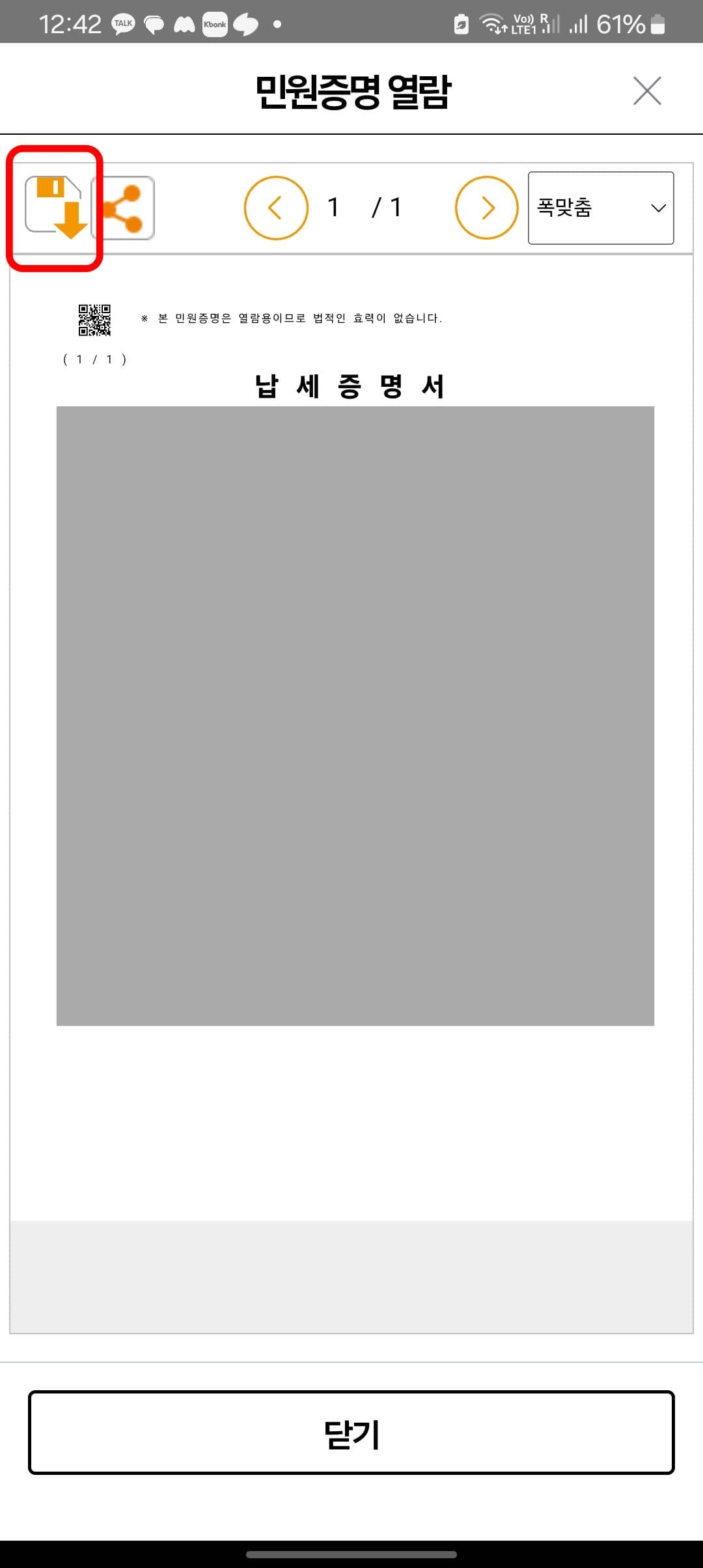 접수목록 조회에서 처리완료된 접수번호를 터치하면 납세증명서를 확인할 수 있습니다. 좌측 상단의 저장 아이콘을 터치하면 PDF 읽기에 사용할 비밀번호 입력 후 모바일에 저장할 수 있습니다.