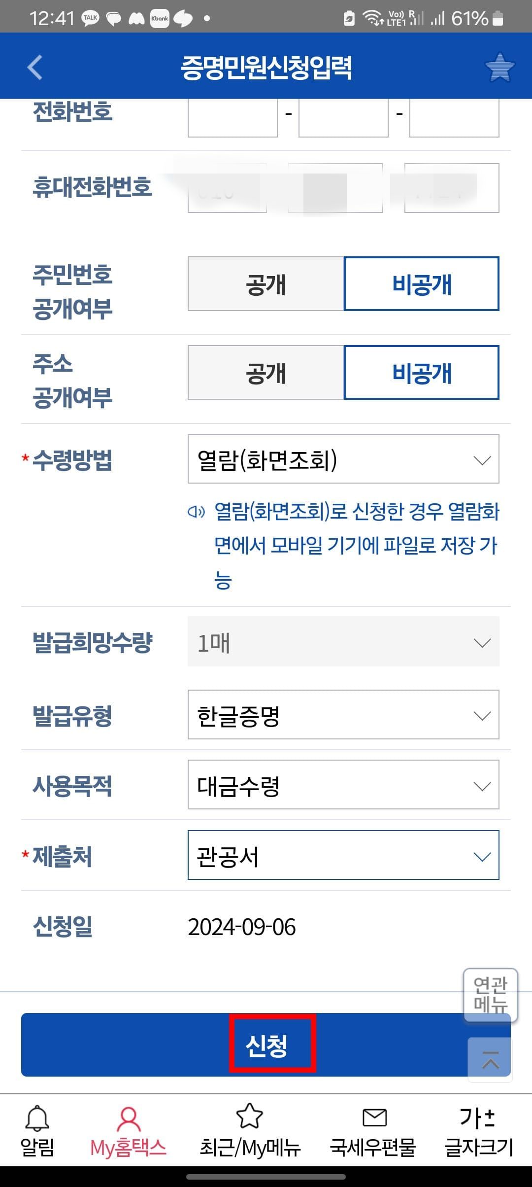 인증이 완료되면 증명민원신청입력 페이지가 표시됩니다. 수령방법을 터치하면 열람(화면조회)를 선택합니다. 이 방법은 열람하고 PDF로 저장할 수 있지만 법적인 효력은 없습니다. 만약 법적인 효력을 가진 증명을 하시려면 인터넷발급 (전자문서지갑)을 선택하면 기관에 바로 제출할 수 있습니다.