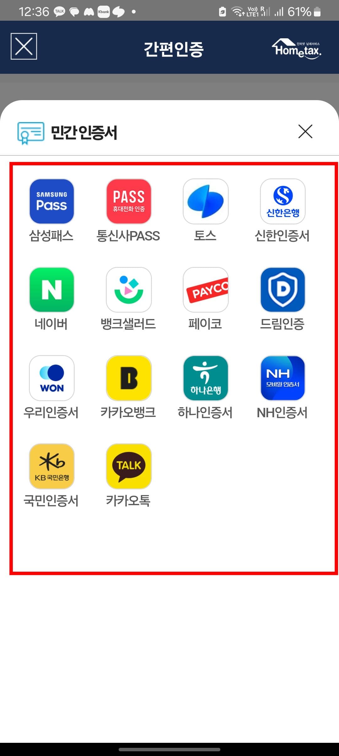 로그인 화면이 표시되면 공동, 간편, 금융인증서를 선택합니다. 간편인증의 경우 보유한 민간인증서 선택 후 이름과 생년월일, 휴대폰번호를 입력하고 하단의 다음 버튼을 터치합니다.