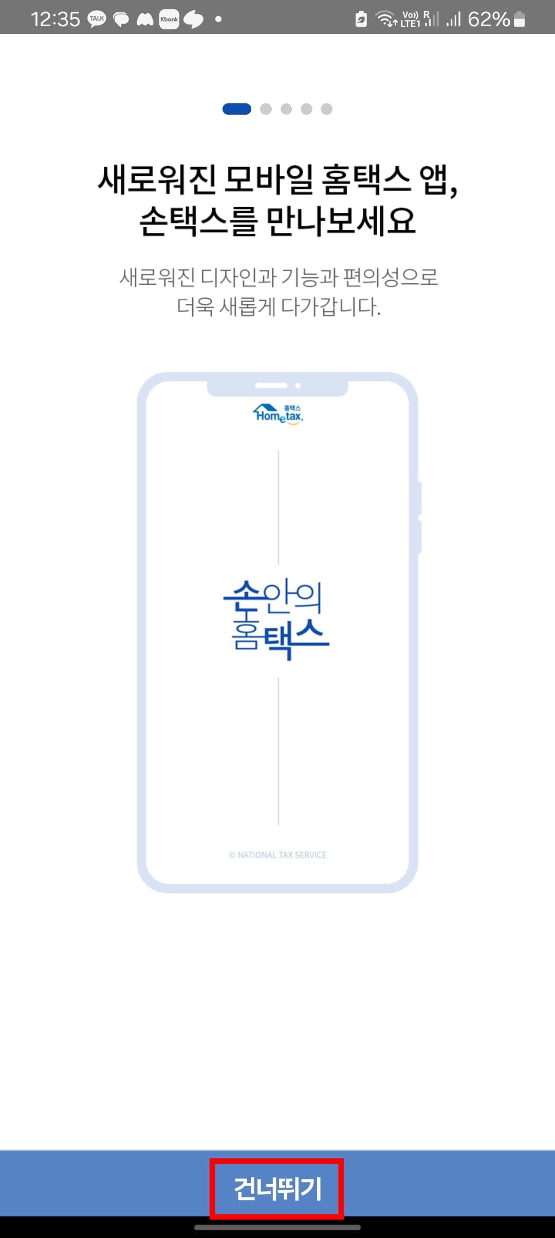 홈택스 앱을 설치하고 실행하면 위와 같은 화면을 보게 됩니다. 하단 건너뛰기를 터치합니다. 이후 모바일 홈택스 바로가기 버튼을 터치합니다.
