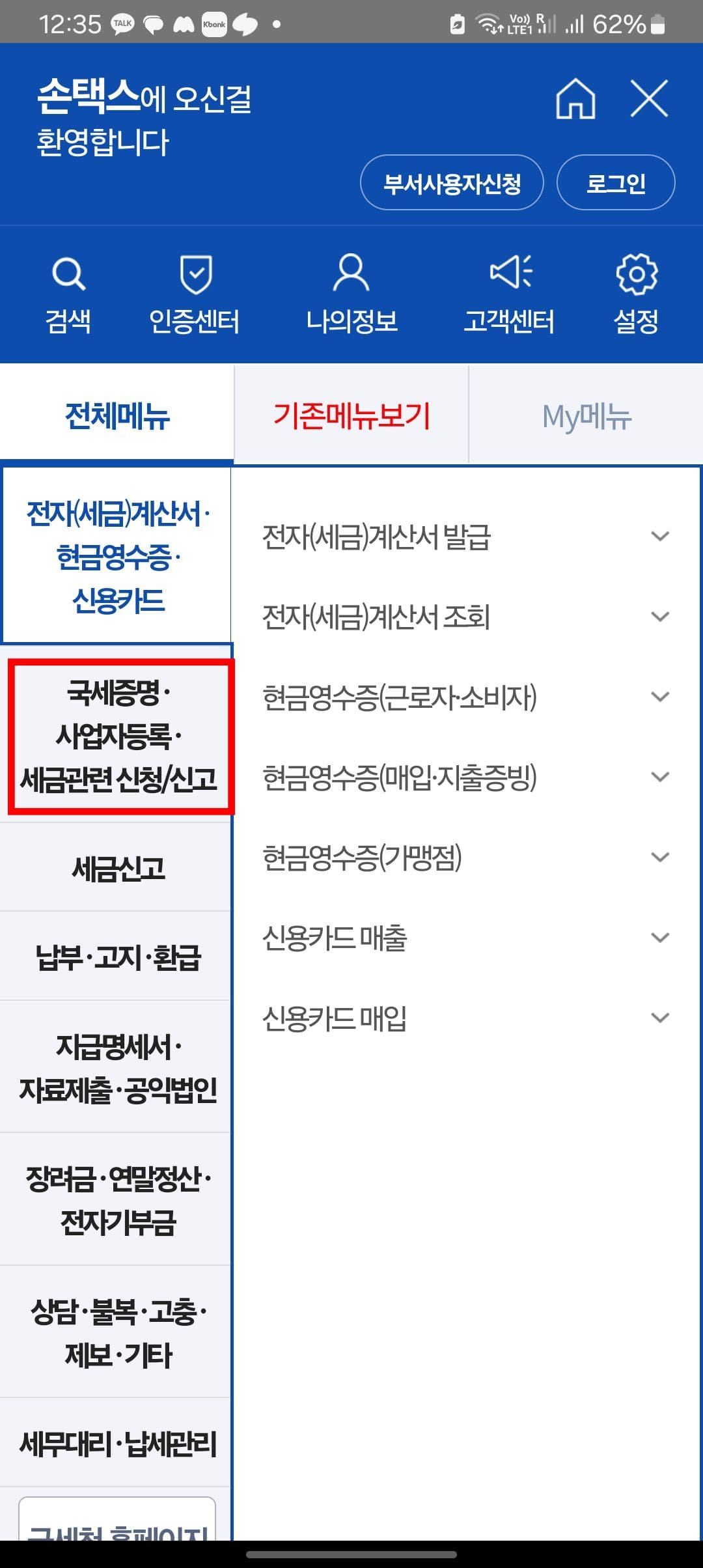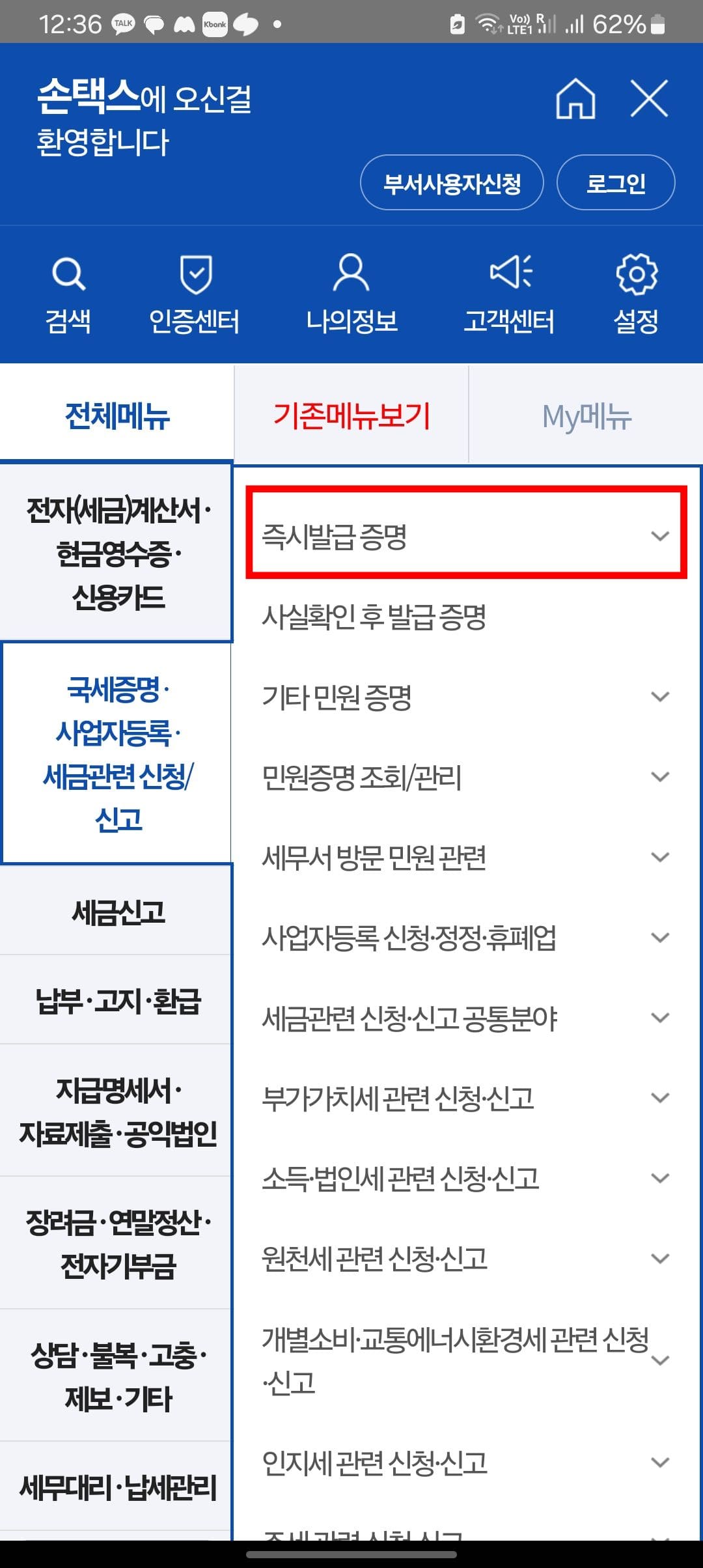 메인 화면이 표시되면 우측 상단의 [전체메뉴]를 터치합니다. 전체메뉴에서 [국세증명 사명자등록 세금 관련 신청/신고] 메뉴를 터치한 후 오른쪽에서 즉시발급 증명을 터치합니다. 아래에 세부 메뉴가 표시되면 납세증명서 (국세완납증명) 메뉴를 터치합니다.