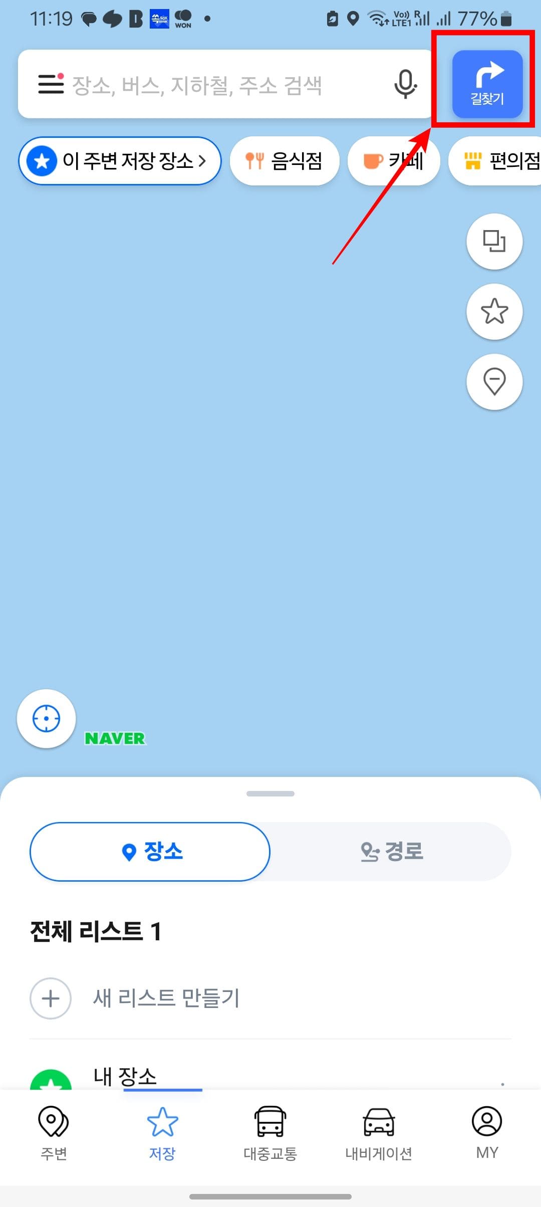 네이버 지도 어플을 설치하고 실행하시면 위와 같은 메인 화면을 확인할 수 있습니다. 우측 상단의 길찾기 버튼을 터치합니다. 네이버 지도 어플도 마찬가지로 대중교통, 자동차, 도보, 자전거 4가지의 이동수단으로 길찾기를 할 수 있습니다. 상단에서 출발지와 도착지를 입력합니다.