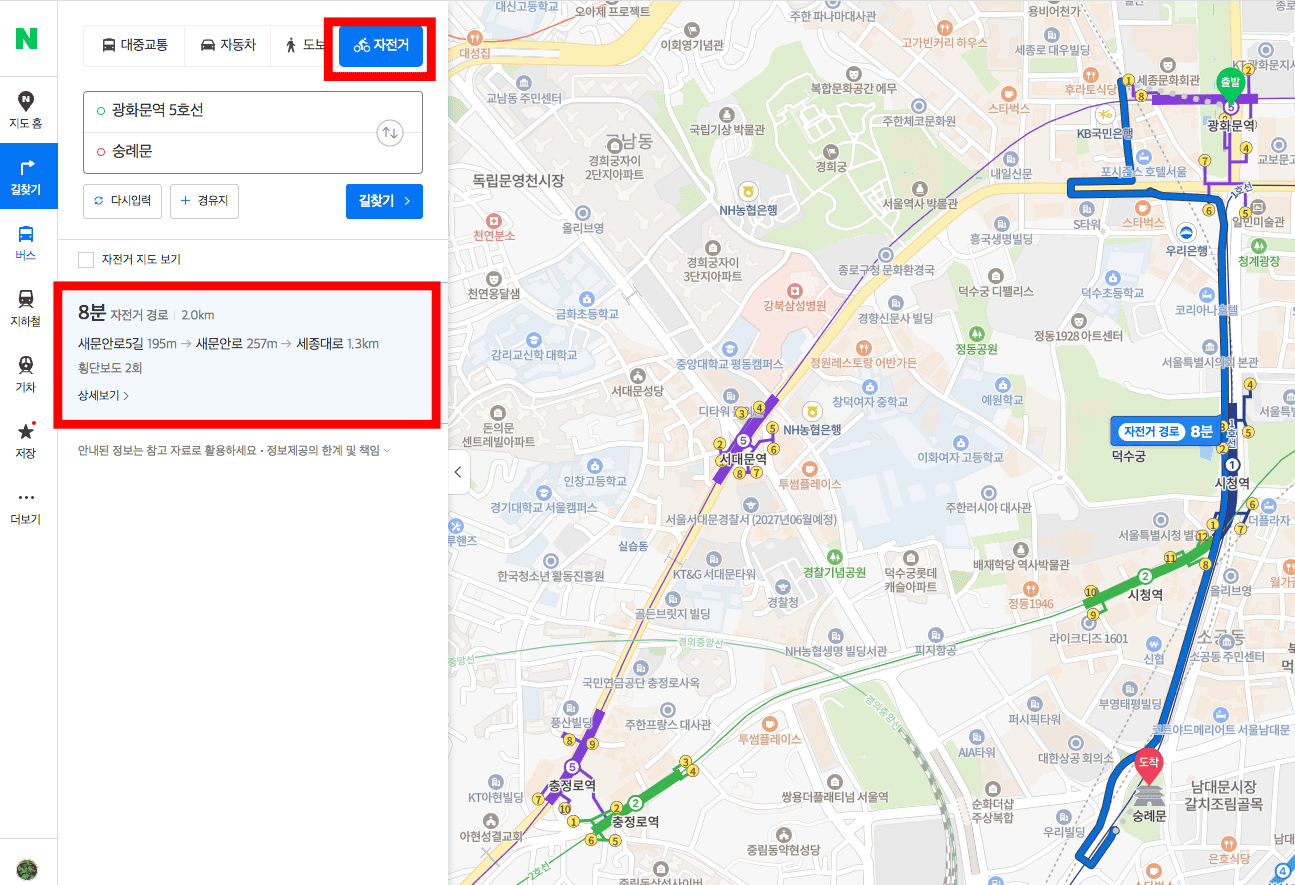 마지막으로 자전거를 이동수단으로 선택해 보았습니다. 마찬가지로 추천경로를 선택하면 상세 경로가 우측에 표시되며 구간별 거리와 총 소요시간이 표시됩니다.