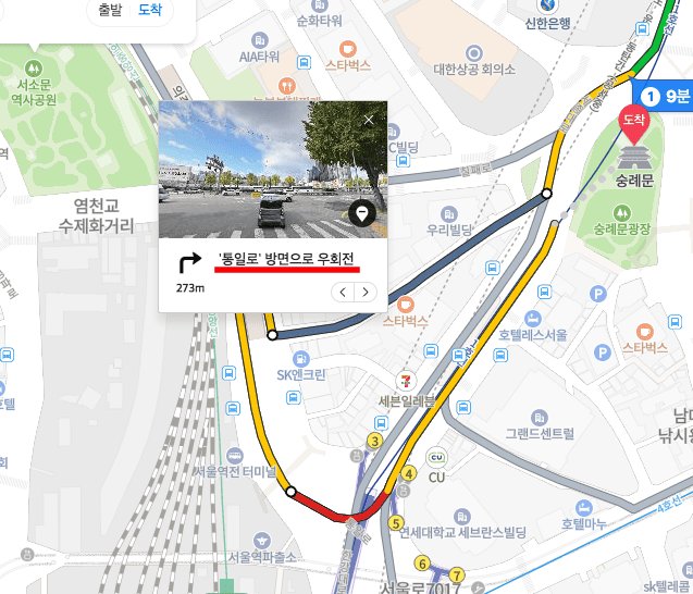 만약 출발지에서 도착지까지 거리뷰를 확인하시려면 우측 메뉴에서 거리뷰를 선택합니다. 이후 거리뷰 아이콘을 원하는 경로로 이동시키면 작은 화면에서 거리뷰를 확인할 수 있습니다.