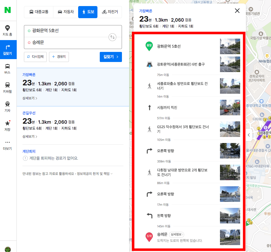 광화문역에서 숭례문까지 길찾기 결과를 확인하면 좌측 하단에서 가장 빠른 길을 찾아볼 수 있으며 경로는 우측 지도에서 확인이 가능합니다.