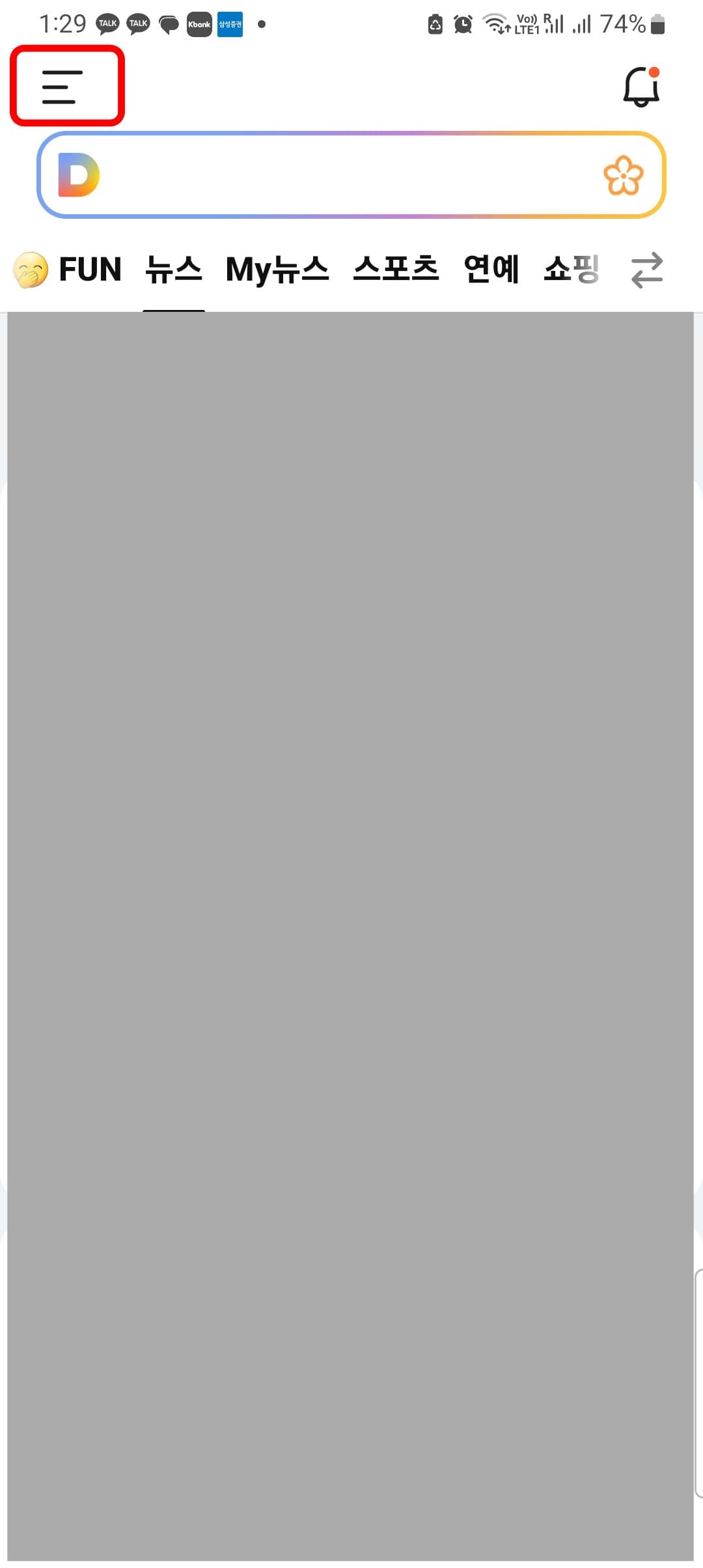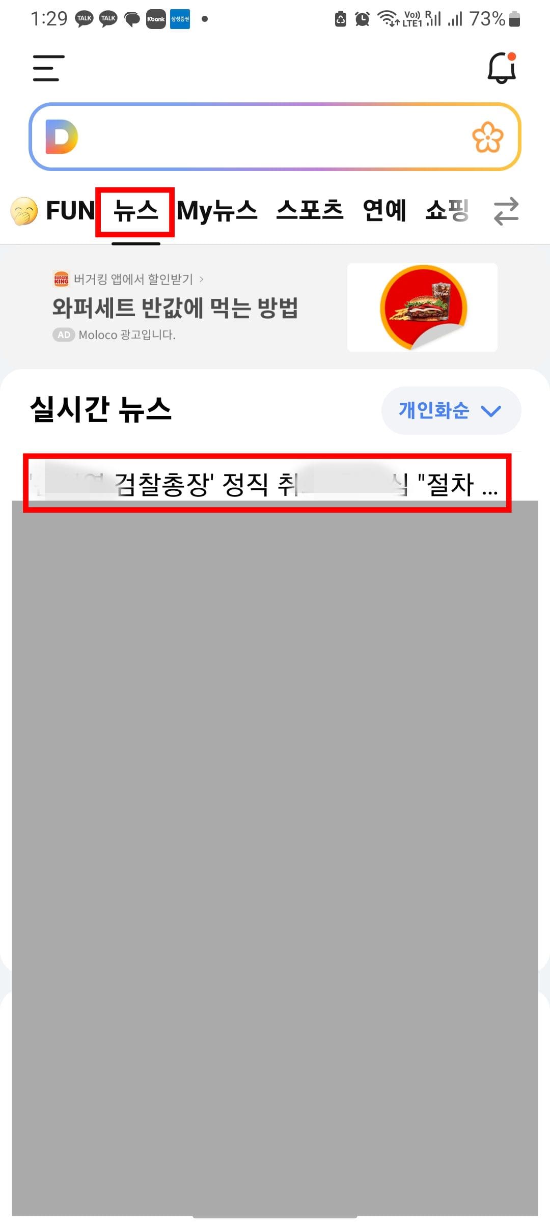 이후 메인 화면으로 돌아와 본문을 확인하면 홈 화면의 뉴스 기사 제목이 커진 것을 확인할 수 있습니다. 본문 내용을 확인하려면 해당 뉴스 기사를 터치하거나 상단 뉴스 메뉴를 터치합니다.