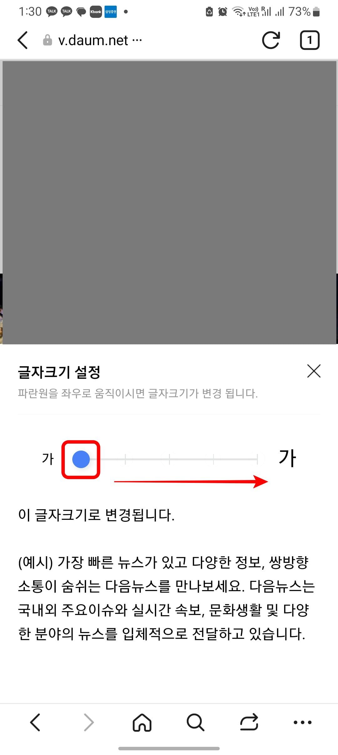 기사를 터치해서 제목이 보이면 제목 우측 하단의 [가] 아이콘을 터치합니다. PC에서와 마찬가지로 글자크기 설정 페이지가 표시됩니다. 파란색 동그라미를 좌측에서 우측으로 이동시킬 수 록 글자크기가 커집니다.