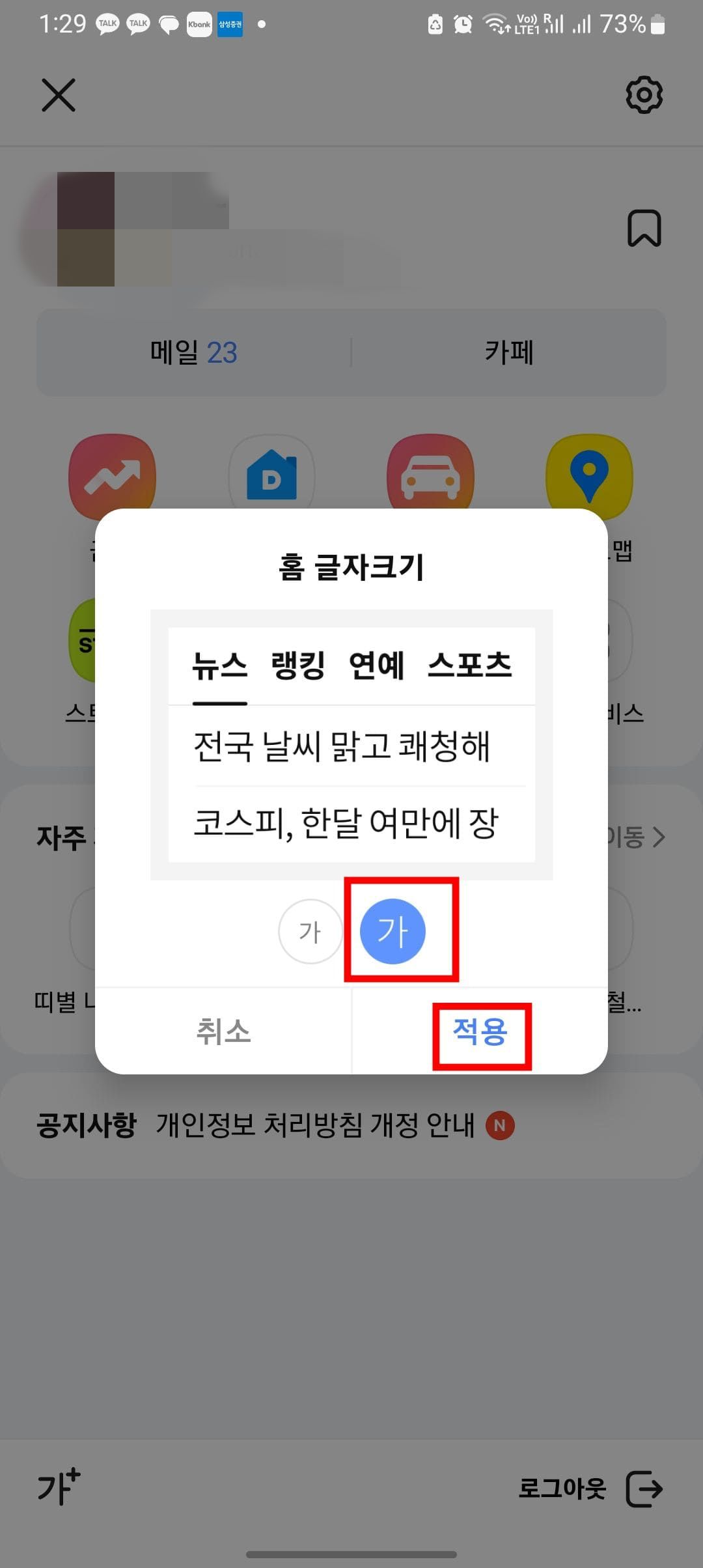 다음 글자크기조절 방법에 대해 알아보겠습니다. 나이가 40이 넘어가니 노안이 찾아와서 작은 글씨를 보기가 힘듭니다. 그래서 스마트폰 글자크기도 크게 설정해두고 있는데요. 그중에서도 제가 가장 자주 사용하는 포털 사이트인 다음에서 뉴스기사나 블로그 글을 읽을 때 글자 크기가 작아서 고민하던 끝에 글자크기를 조절할 수 있게 되었습니다.