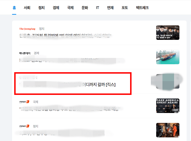 다음 포털 사이트에 방문하시면 위와 같은 메인 화면을 볼 수 있습니다. 상단 메뉴에서 글이 가장 많은 뉴스 메뉴를 클릭합니다. 뉴스 기사들이 표시되면 아무 기사나 하나 선택합니다.
