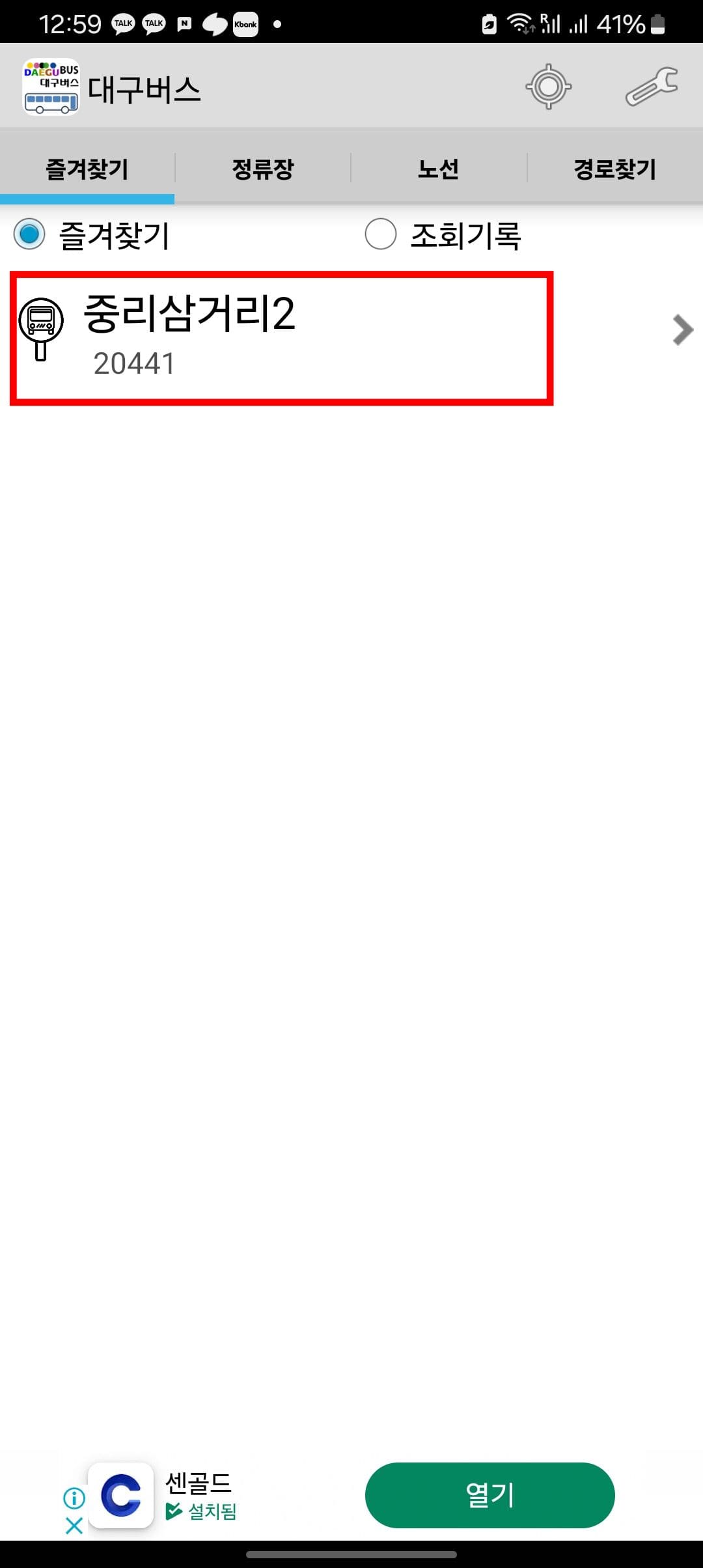 이번에는 시내버스 경로를 찾아보도록 하겠습니다. 앱 상단에서 [경로찾기] 메뉴를 터치합니다. 출발지와 도착지에 정류장 이름을 입력합니다. 이후 하단의 [경로검색] 버튼을 터치합니다. 하단에서 해당 경로에 대한 검색결과를 확인할 수 있습니다.