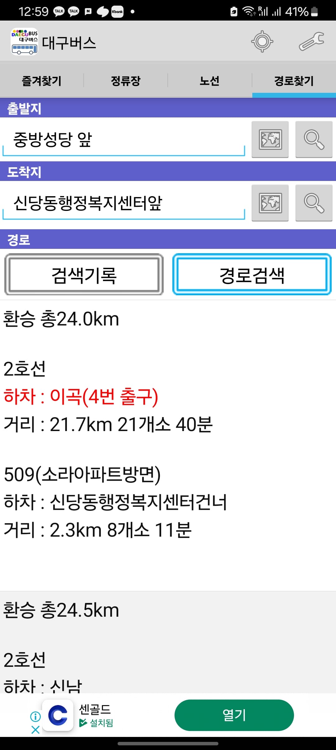 이번에는 시내버스 경로를 찾아보도록 하겠습니다. 앱 상단에서 [경로찾기] 메뉴를 터치합니다. 출발지와 도착지에 정류장 이름을 입력합니다. 이후 하단의 [경로검색] 버튼을 터치합니다. 하단에서 해당 경로에 대한 검색결과를 확인할 수 있습니다.