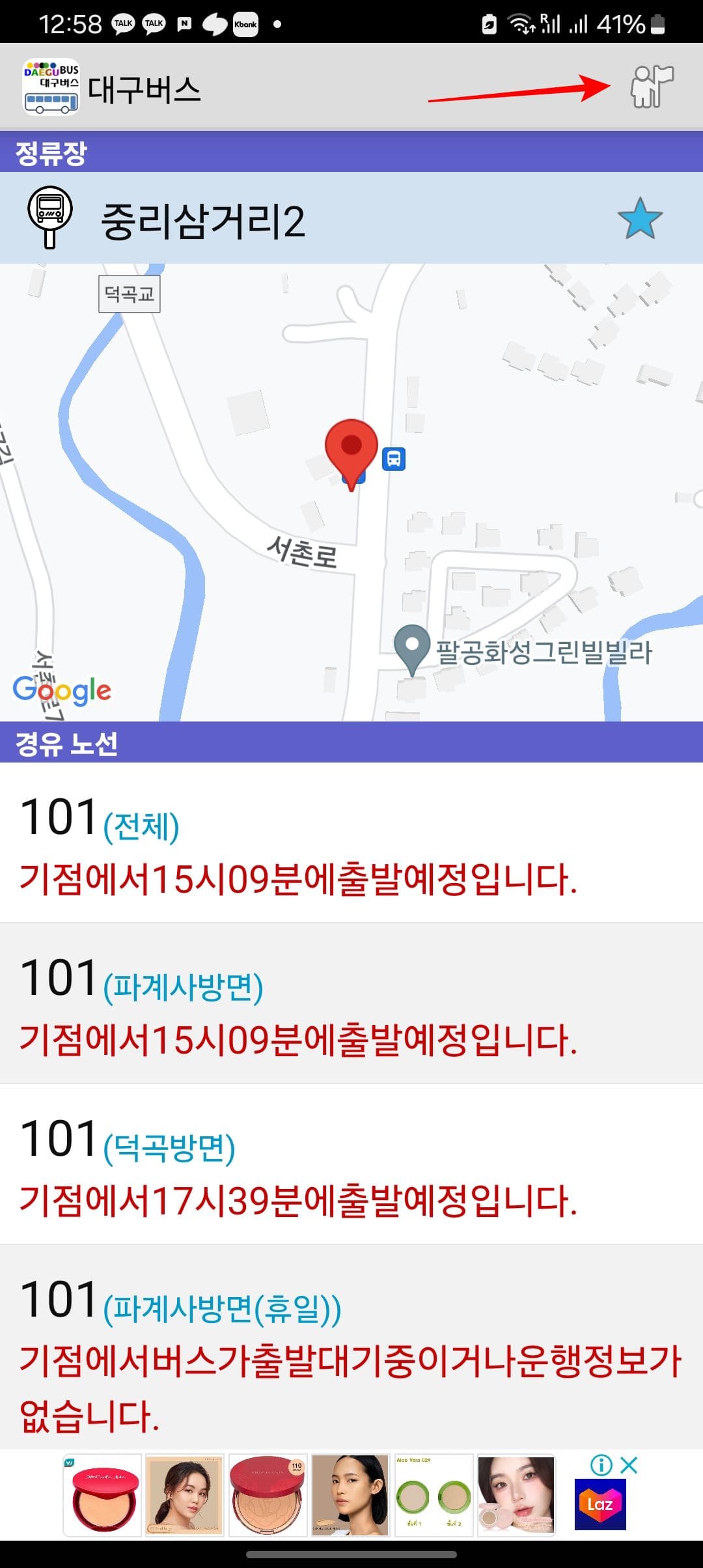 해당 정류장에 대한 버스 운행시간이 표시됩니다. 우측 상단의 별 아이콘을 선택하면 해당 정류장 정보가 즐겨찾기에 저장되니 참고하시기 바랍니다. 앱 우측 상단의 사람 아이콘을 클릭하면 해당 정류장이 지도에 표시됩니다.