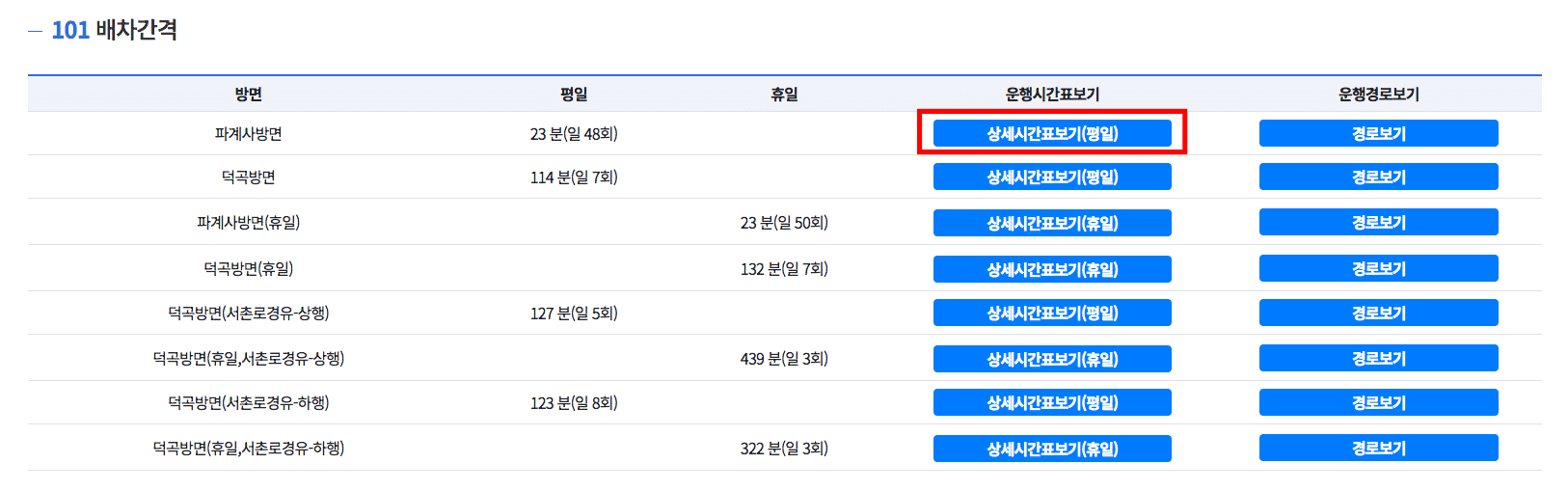 101번 노선의 배차간격을 확인할 수 있습니다. 상세시간표보기를 선택하면 더 자세한 시간표 확인이 가능합니다. 우측 상단의 경로보기를 선택하시면 해당노선에 대한 더 자세한 경로를 확인할 수 있습니다.