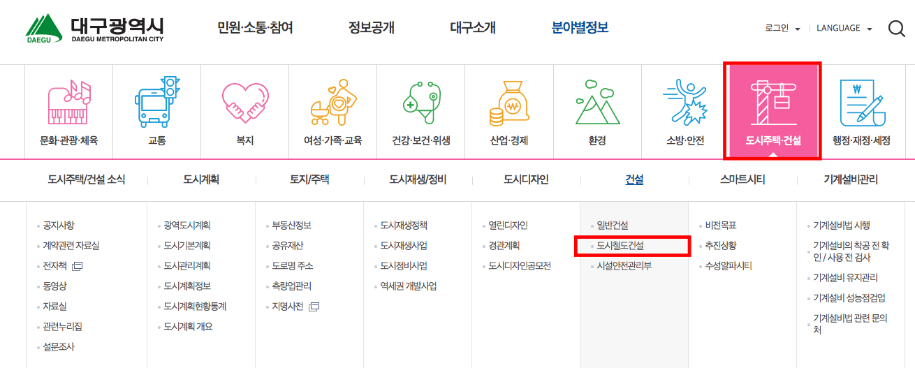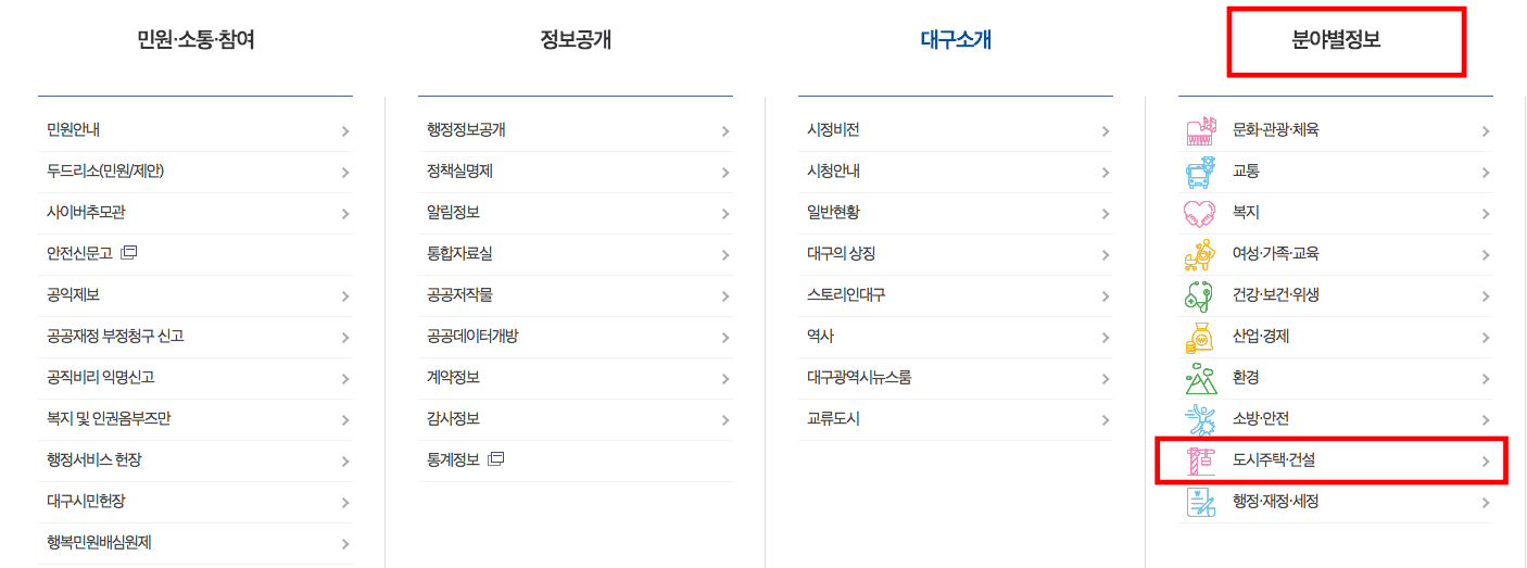 대구광역시 홈페이지에 방문하시면 위와 같은 화면을 볼 수 있습니다. 상단 메뉴 분야별정보로 마우스를 가져갑니다. 분야별 정보의 세부 메뉴가 표시되면 하단에서 도시주택 건설 메뉴를 클릭합니다.