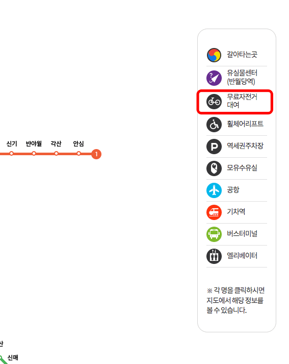 사이버스테이션 우측을 확인하시면 역에서 이용할 수 있는 편의시설 검색이 가능합니다. 필요한 항목을 선택하면 노선도에 표시됩니다. 여기에서는 무료 자전거 대여 서비스를 선택해 보겠습니다.