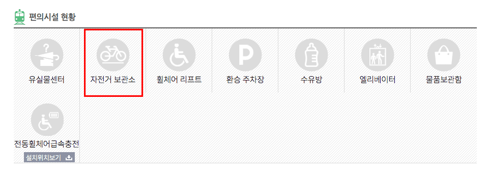 사이버스테이션 하단으로 스크롤을 내리면 편의시설 현황을 볼 수 있습니다. 이 서비스는 원하는 편의시설이 어느 역에 구비되어 있는지 확인하는 방법입니다. 여기에서는 자전거 보관소를 선택해 보겠습니다.