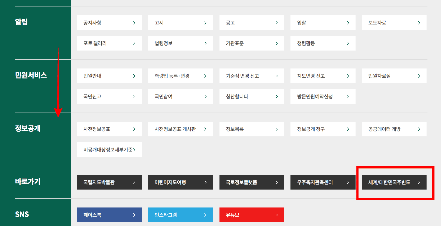 국토지리정보원 홈페이지에 방문하시면 위와 같은 화면을 볼 수 있습니다. 상단 메뉴 우측 끝에 있는 3선 메뉴를 선택합니다. 이후 스크롤을 하단으로 내려 바로가기 우측 끝의 세계/대한민국 주변도 메뉴를 클릭합니다.