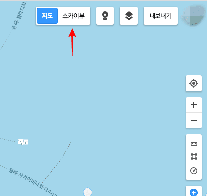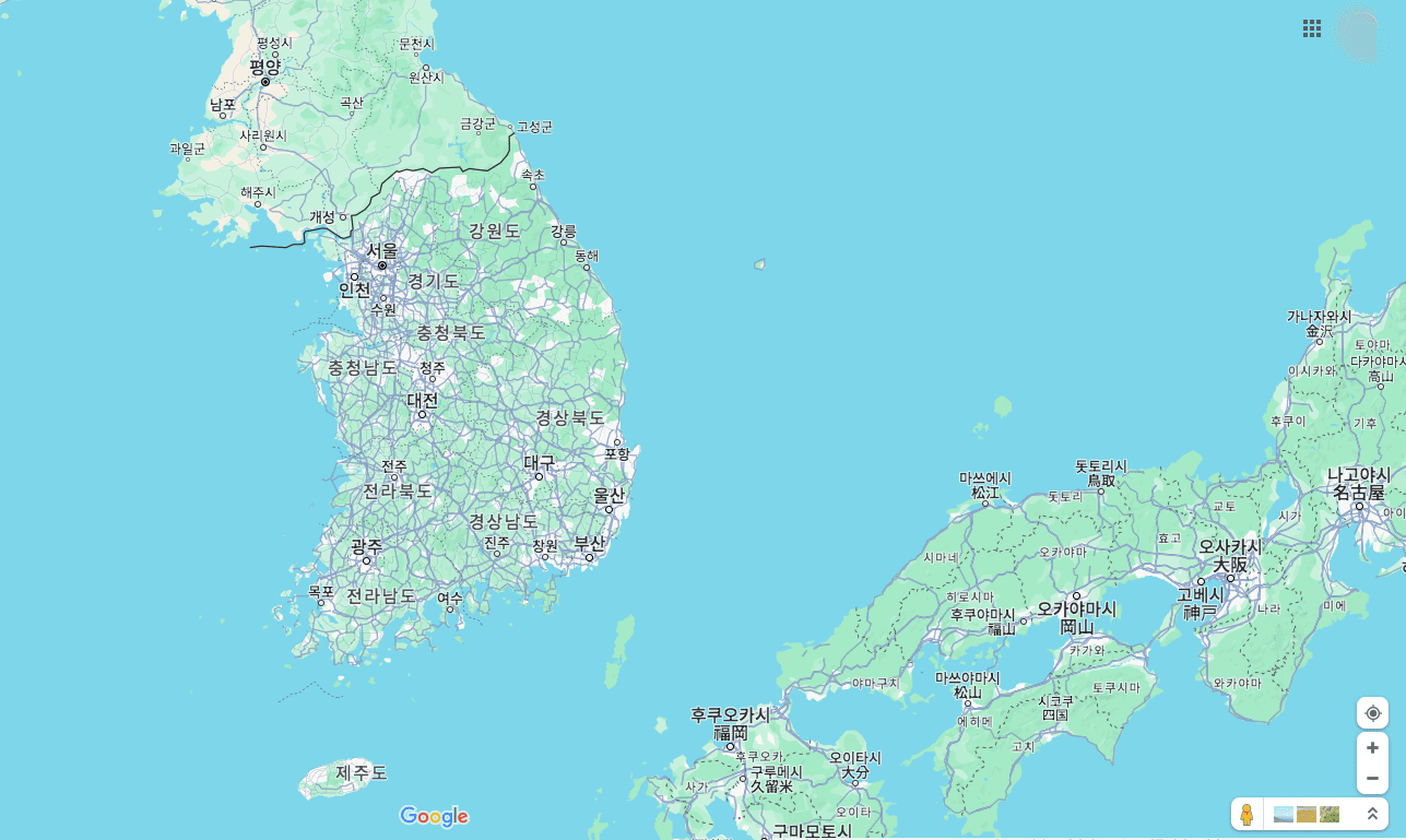 구글맵에 도착하시면 위와 같은 페이지를 볼 수 있습니다. 마찬가지로 우측 하단에 있는 +,- 버튼을 클릭하여 지도를 축소해 줍니다. 이후 위와 같은 대한민국 지도를 확인할 수 있습니다.