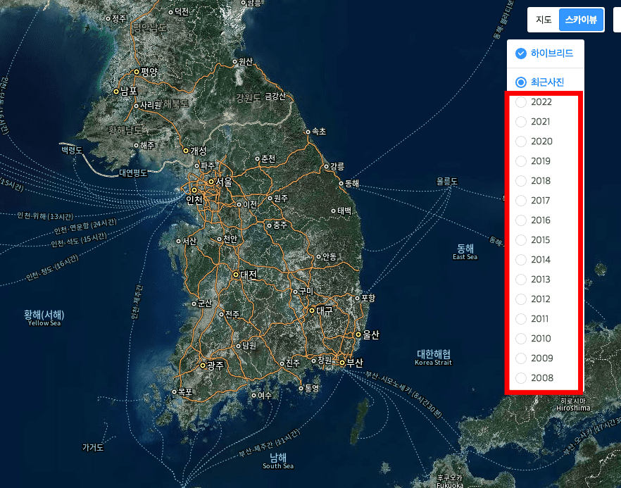 만약 위성사진을 원하신다면 우측 상단의 스카이뷰 메뉴를 선택합니다. 이후 최근사진 또는 년도를 선택하면 원하는 년도의 위성사진을 확인할 수 있습니다.