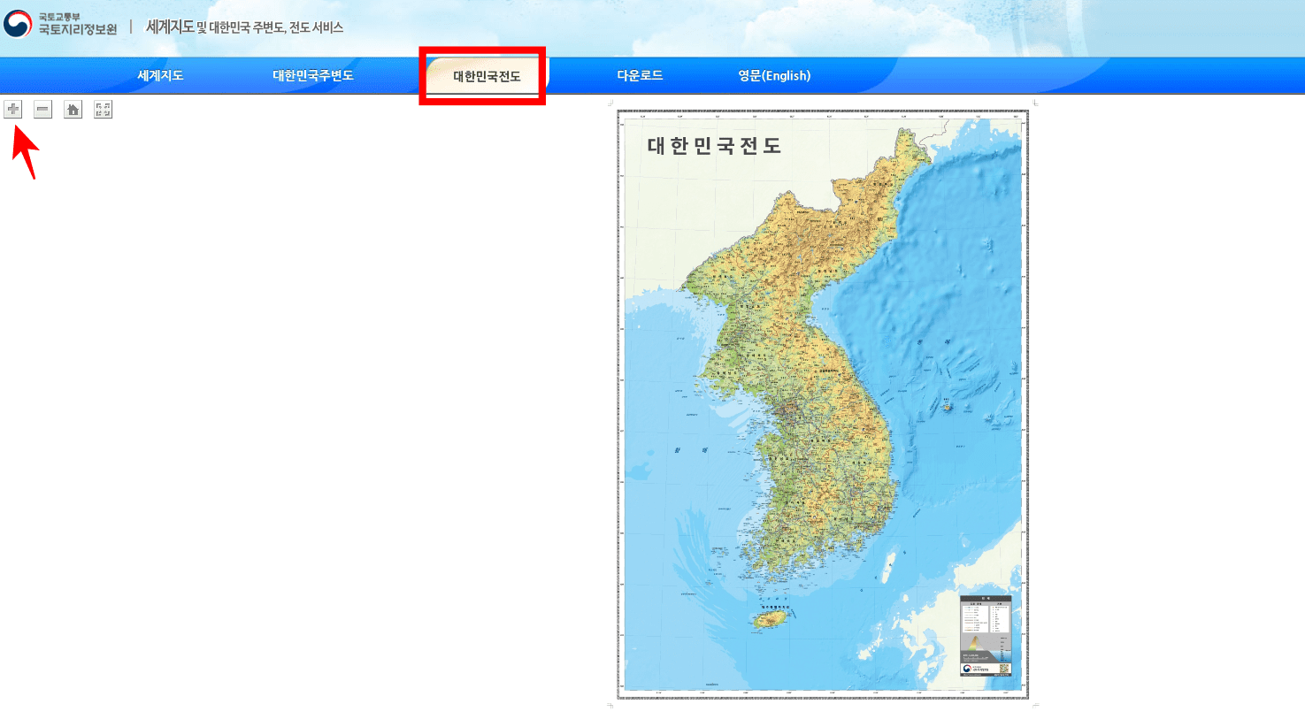 새 페이지가 표시되면 상단 메뉴에서 [대한민국 전도]를 선택합니다. 대한민국 전도가 화면에 보이면 좌측 상단의 + 버튼을 클릭해서 확대할 수 있습니다. 강과 산 이름이 나올 정도로 크게 확대할 수 있습니다.