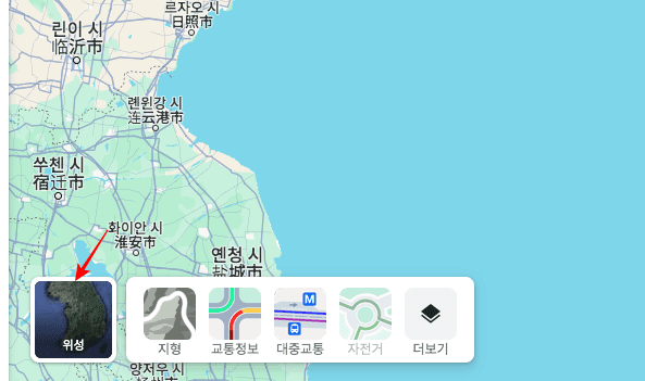 위성사진으로 보고 싶으시다면 좌측 하단의 [레이어] 메뉴를 클릭합니다. 레이어 메뉴는 교통정보다 대중교통, 자전거 도로 등을 강조하여 볼 수 있는 메뉴를 제공합니다. 위성을 선택하면 위와 같은 위성지도를 확인할 수 있습니다.