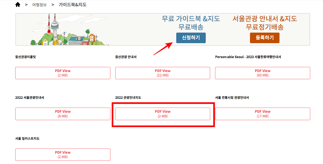 여행정보 > 가이드북&지도 메뉴를 클릭합니다. 하단에서 2022 관광안내지도를 클릭하시면 PDF파일로 된 서울 지도를 저장할 수 있습니다. 만약 무료 가이드북과 서울 지도를 실물로 받고 싶으시다면 위의 신청하기 버튼을 클릭하고 정보를 입력합니다.