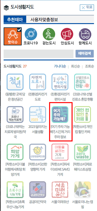 도시생활지도의 좌측메뉴를 살펴보시면 핫이슈 카테고리 하단에서 주차정보, 자전거도로, 개인컵 할인 카페, 선한 영향력 가게 등 다양한 테마 검색이 가능합니다. 여기에서는 [여기 주차 가능해?] 메뉴를 선택해 보시기 바랍니다.