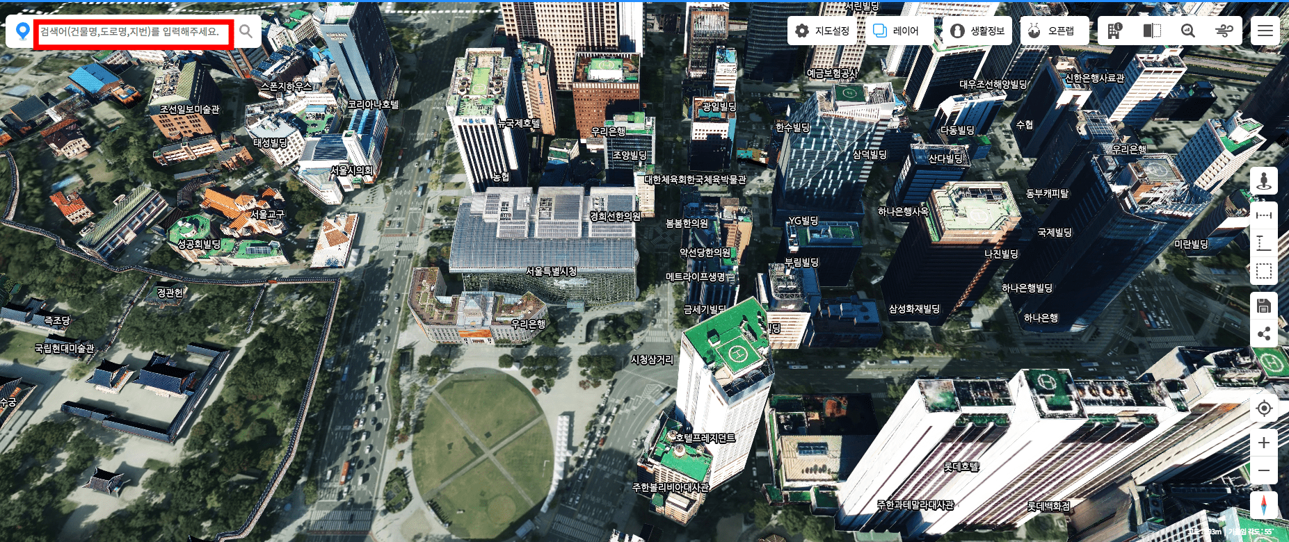 좀 더 입체적인 서울 지도 보기를 이용하고 싶으시다면 메인 메뉴에서 3D 서울지도를 선택해 보시기 바랍니다. 3D서울지도는 모든 건축물과 시설물을 3D로 표시해 주어 더 실감 나는 서울을 느껴볼 수 있습니다. 좌측 상단에 검색어를 입력하여 조회하면 원하는 장소를 찾아볼 수 있으니 직접 확인해 보시기 바랍니다.