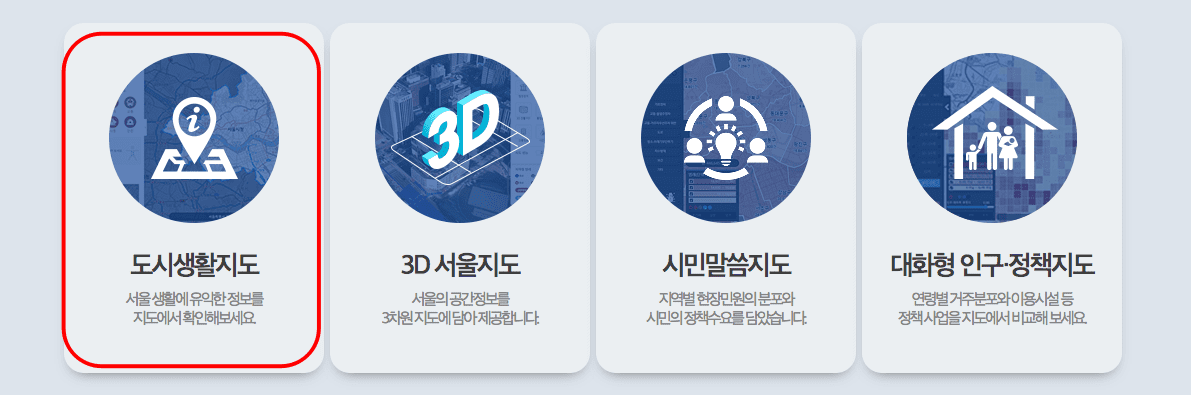 스마트 서울맵에 방문하시면 위와 같은 화면을 볼 수 있습니다. 메인 화면에서 스크롤을 약간 내려주시기 바랍니다. 스크롤을 내려보면 도시생활지도, 3D서울지도, 시민말씀지도, 대화형 인구 정책 지도 총 4가지의 지도 타입을 확인할 수 있습니다. 도시생활지도 메뉴를 클릭합니다.
