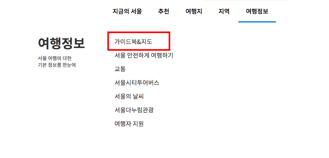 여행정보 > 가이드북&지도 메뉴를 클릭합니다. 하단에서 2022 관광안내지도를 클릭하시면 PDF파일로 된 서울 지도를 저장할 수 있습니다. 만약 무료 가이드북과 서울 지도를 실물로 받고 싶으시다면 위의 신청하기 버튼을 클릭하고 정보를 입력합니다.