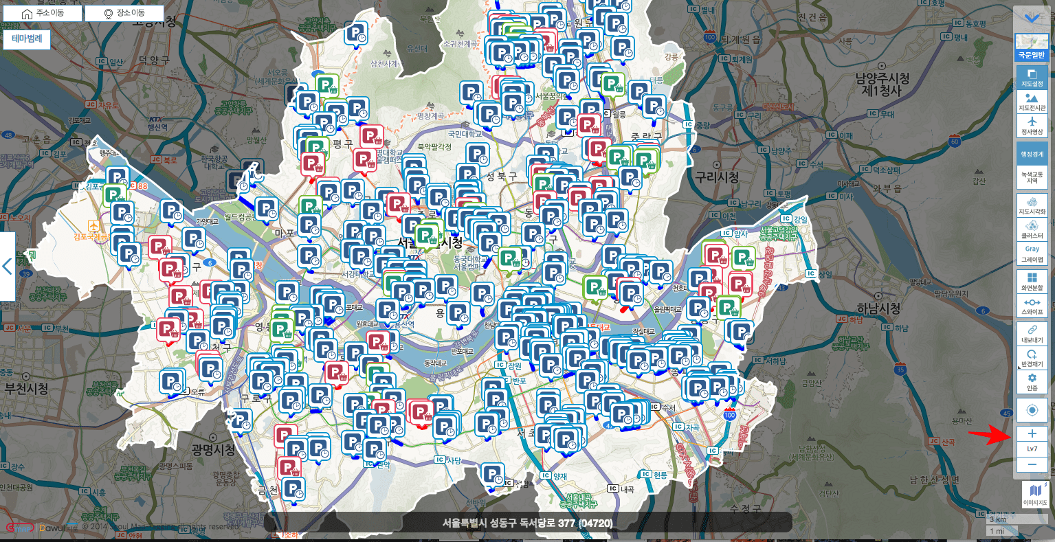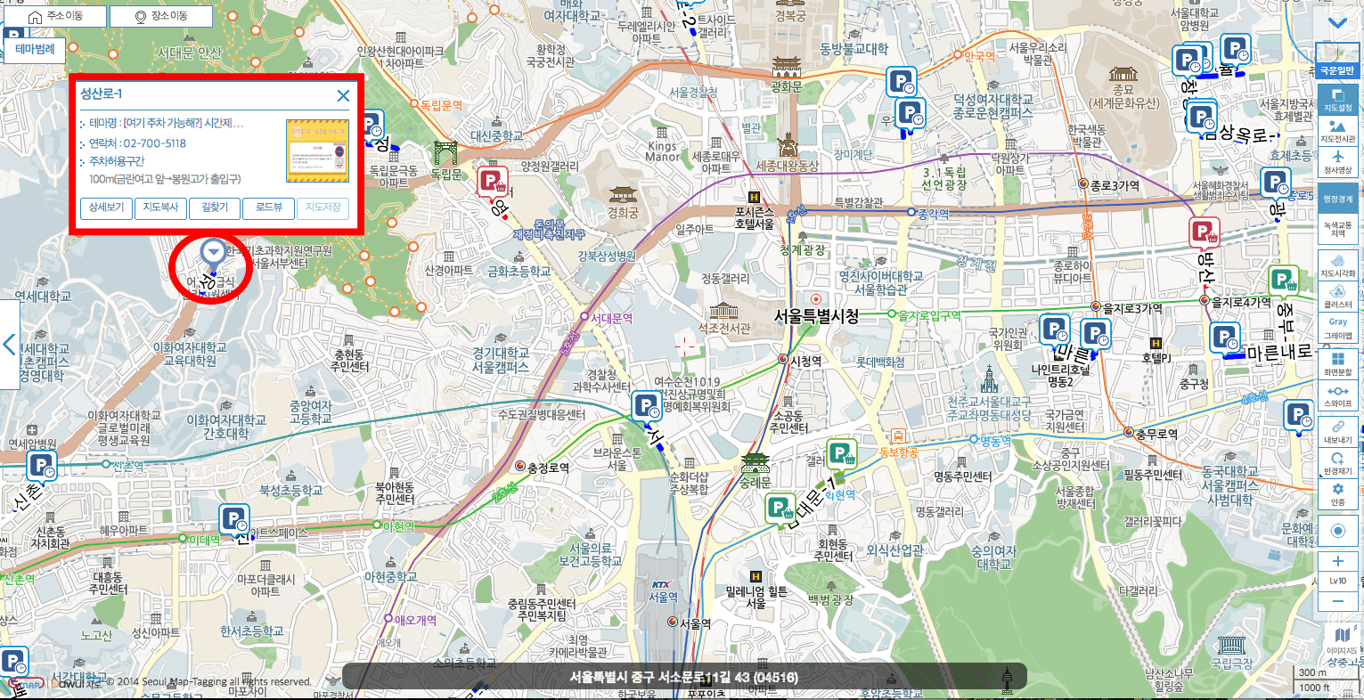 우측 서울 지도를 보시면 서울시에 있는 모든 주차공간이 표시되는 것을 확인할 수 있습니다. 다시 확대 버튼을 클릭합니다. 지도 위에서 P마크를 클릭하면 주차장소의 연락처 및 허용구간, 길 찾기 등의 정보를 확인할 수 있습니다.