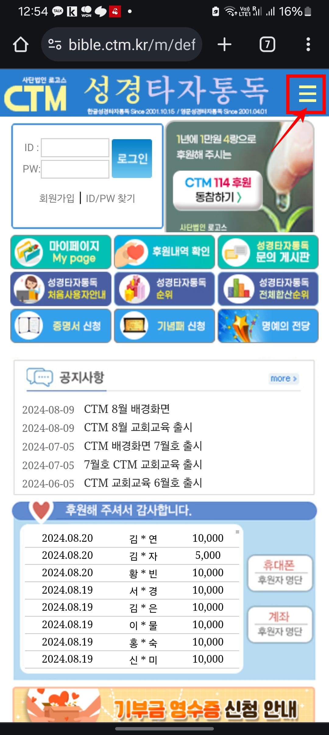 모바일에서 CTM성경타자통독 홈페이지에 방문하시면 위와 같은 화면을 확인할 수 있습니다. 먼저 우측 상단의 3선 아이콘을 터치합니다. 세부 메뉴가 표시되면 제일 위에 있는 [한글성경통독]을 터치합니다.
