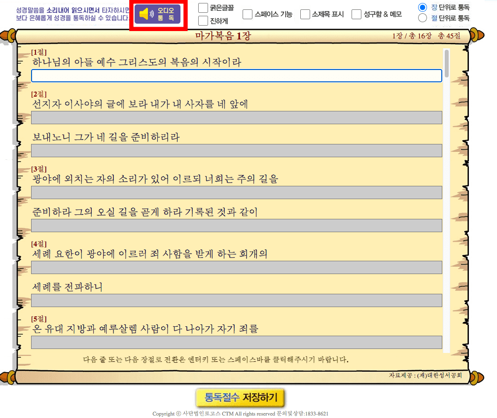 구약성경으로 돌아와보면 출애굽기의 통독 진행상황을 확인할 수 있습니다. 이번에는 신약성경의 마가복음을 필사해 보겠습니다. 마가복음 1장이 표시되면 화면 상단의 오디오 통독을 클릭합니다. 이 기능은 화면에 보이는 성경을 읽어주는 기능입니다. 다시 한번 클릭하면 오디오가 재생되지 않습니다.