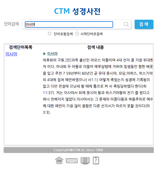 만약 성경 타자 통독을 진행하다가 모르는 단어가 나오면 화면 우측 상단의 [성경단어사전]을 클릭합니다. 성경사전이 팝업으로 표시되면 단어검색에 검색할 단어를 입력하고 우측의 검색 버튼을 클릭합니다. 이사야에 대한 자세한 내용을 확인해 볼 수 있었으니 직접 확인해 보시기 바랍니다.