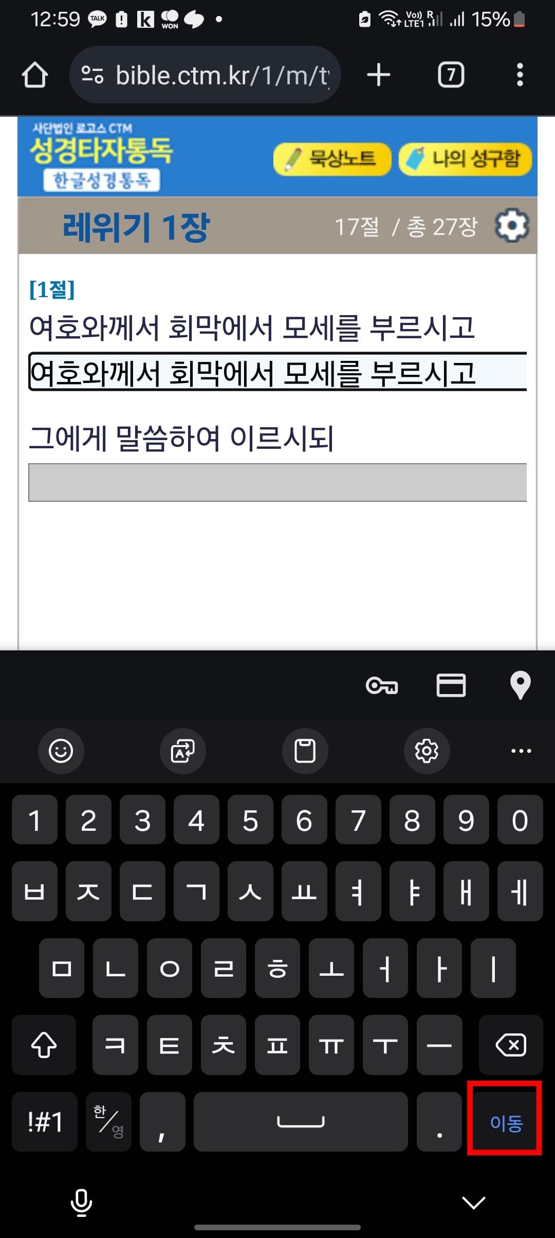 PC에서와 마찬가지로 문장 밑의 입력란에 1절 내용을 입력합니다. 모바일에서는 엔터키가 없으므로 [이동] 버튼을 터치하면 다음문장으로 넘어갑니다.