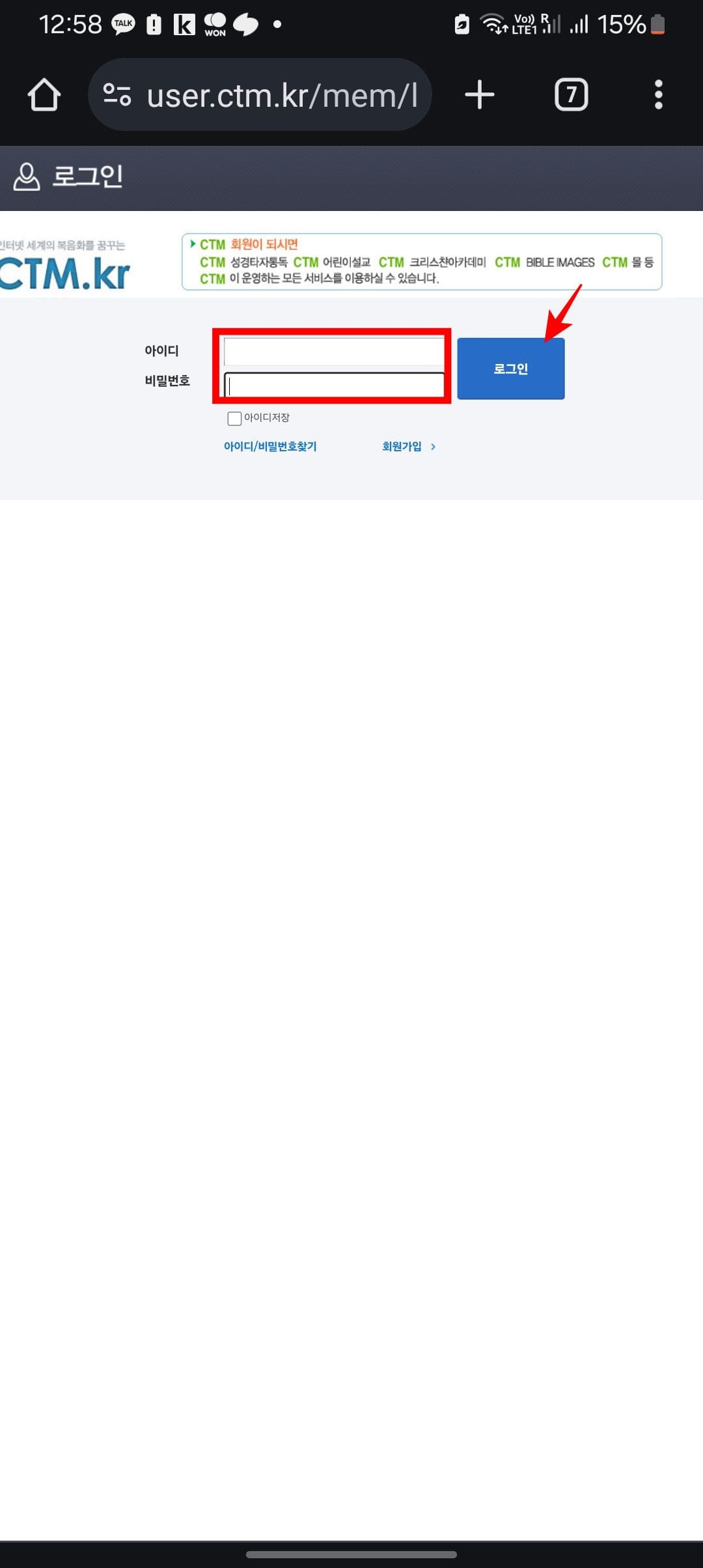 CTM성경타자통독 홈페이지에 방문하시면 위와 같은 메인 화면을 보게 됩니다. 먼저 좌측 상단에 아이디와 비밀번호 입력 또는 회원가입을 합니다. 이후 상단 메인 메뉴에서 [한글성경통독] 메뉴를 마우스로 클릭합니다.