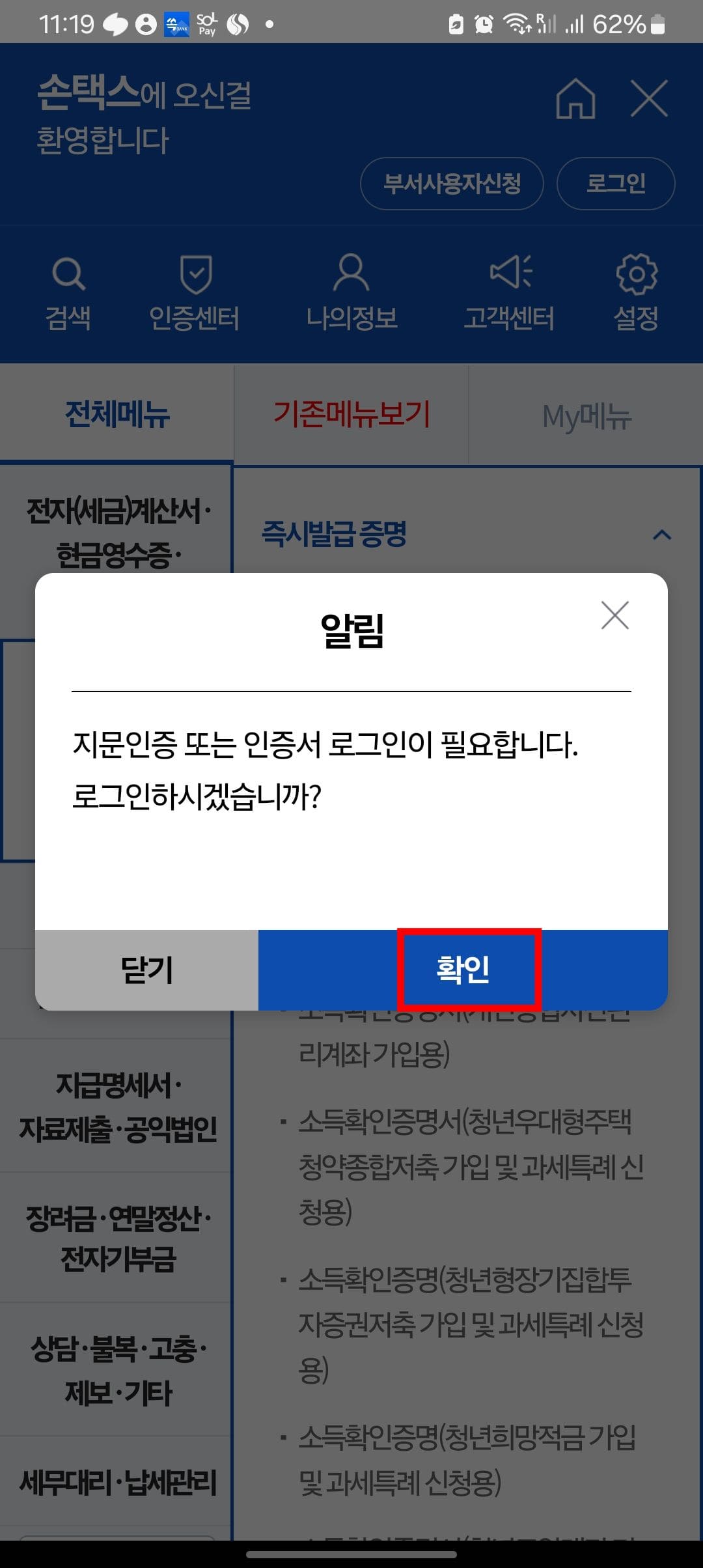 로그인이 필요하다는 알림이 표시되면 하단의 확인버튼을 터치합니다. 사용자인증 선택 페이지에서 공동인증서, 간편인증, 금융인증서, 지문인증 중 보유한 인증 수단을 선택합니다. 간편 인증을 선택하면 먼저 보유한 민간인증서를 선택하고 이름, 생년월일 등의 정보를 입력한 후 인증을 합니다. 모든 인증이 완료되었으면 간편 인증 페이지로 돌아와 하단의 [인증 완료] 버튼을 터치합니다.