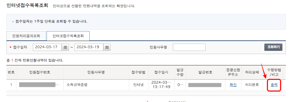 인터넷접수목록 조회 페이지가 표시되면 하단에서 민원신청내역을 확인할 수있습니다. 우측 끝에 있는 출력 버튼을 클릭하면 소득금액증명서가 화면에 표시됩니다. 소득금액증명서가 표시되면 내용을 확인하고 좌측 상단의 프린터 버튼을 클릭하여 발급을 완료되니 직접 확인해 보시기 바랍니다.