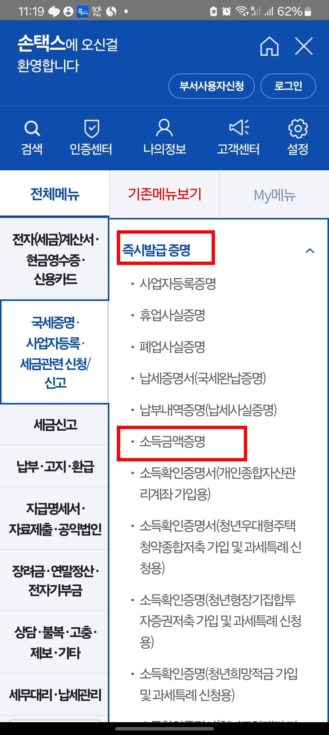 손택스 앱을 실행하면 위와 같은 첫 화면이 보여집니다. 우측 상단의 전체메뉴를 터치합니다. 전체메뉴 두 번째 위치한 [국세증명, 사업자등록, 세금 관련 신청/신고] 메뉴를 터치하고 우측에서 [즉시발급 증명] 메뉴를 터치합니다. 이후 즉시발급 증명 하단에서 소득금액증명을 터치합니다.